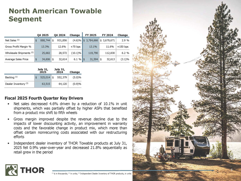 5 Change FY 2024 FY 2025 Change Q4 2024 Q4 2025 ($ in thousands) Net Sales – Segments 2.9 % $ 3,679,671 $ 3,784,666 (4.6)% $ 931,856 $ 888,744 North American Towable (11.0)% 2,445,850 2,175,604 7.8 % 517,319 557,412 North American Motorized (10.1)% 3,364,980 3,023,961 (2.2)% 943,424 923,051 European 7.7 % 552,907 595,259 9.2 % 141,568 154,576 Other, net (4.6)% $ 10,043,408 $ 9,579,490 (0.4)% $ 2,534,167 $ 2,523,783 Total (50) bps 14.5% 14.0% (110) bps 15.8% 14.7% Gross Profit Margin % (2.5)% $ 265,308 $ 258,559 39.7 % $ 90,015 $ 125,757 Net Income (1) (2.0)% $ 4.94 $ 4.84 40.5 % $ 1.68 $ 2.36 Diluted Earnings per Share (1) 5.9 % $ 545,548 $ 577,923 (23.5)% $ 338,016 $ 258,674 Cash Flows from Operations (13.8)% $ 714,655 $ 615,839 2.6 % $ 219,025 $ 224,804 EBITDA (2) (9.7)% $ 730,095 $ 659,126 (4.1)% $ 218,392 $ 209,506 Adjusted EBITDA (2) THOR remains focused on enhancing the fundamentals of our business and executing on our strategic plan (1) (2) Attributable to THOR Industries, Inc. See the Appendix to this presentation for reconciliation of non - GAAP measures to most directly comparable GAAP financial measures Fourth Quarter & Fiscal 2025 Summary Fourth Quarter and Fiscal 2025 Highlights • North American Towable and North American Motorized segments saw market share inflect during the fourth quarter as strategic initiatives executed throughout the fiscal year continued to gain traction • Dealer inventory turns improved sequentially and the North American channel is appropriately positioned heading into the fall • FY 2025 cash flows from operations surpassed the prior year as our management teams continue to execute on our proven operating model • Launched earlier during the fiscal year, THOR’s strategic organizational restructuring plan to optimize enterprise structure and strengthen our brand portfolio progressed during the fourth quarter and continues to put us in a favorable position to achieve additional operating efficiencies