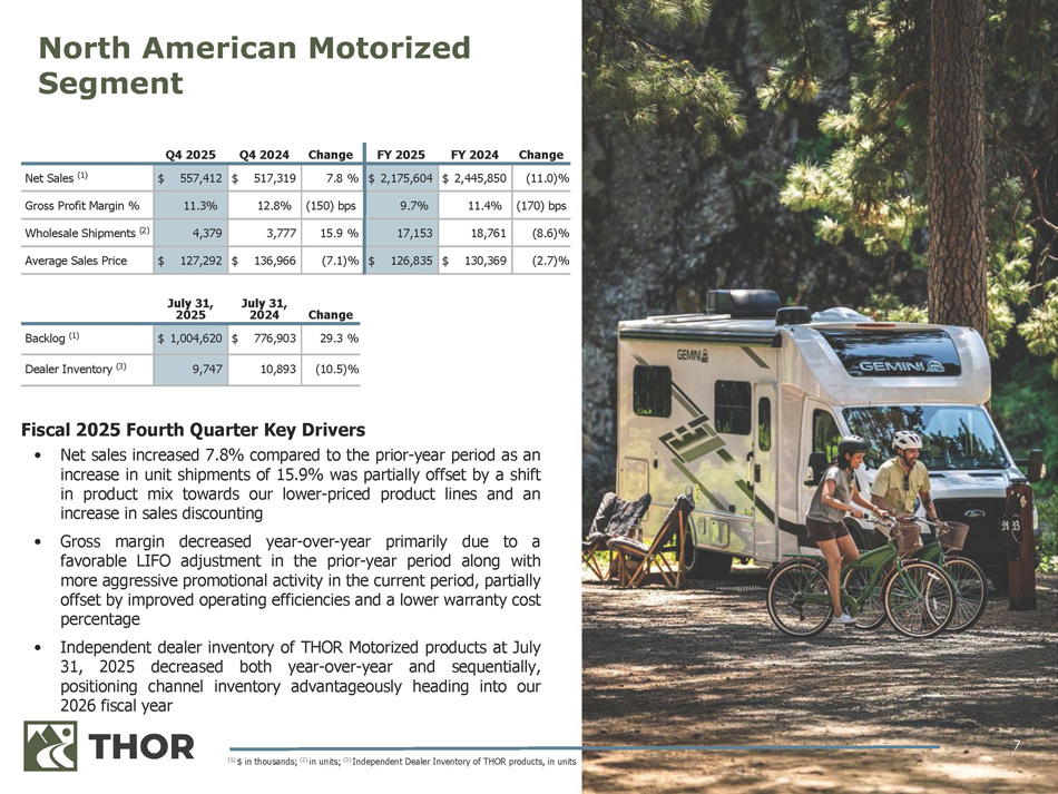 6 Fiscal 2025 Fourth Quarter Key Drivers • Net sales decreased 4 . 6 % driven by a reduction of 10 . 1 % in unit shipments, which was partially offset by higher ASPs that benefited from a product mix shift to fifth wheels • Gross margin improved despite the revenue decline due to the impacts of lower discounting activity, an improvement in warranty costs and the favorable change in product mix, which more than offset certain nonrecurring costs associated with our restructuring efforts • Independent dealer inventory of THOR Towable products at July 31 , 2025 fell 0 . 9 % year - over - year and decreased 21 . 8 % sequentially as retail grew in the period North American Towable Segment Change FY 2024 FY 2025 Change Q4 2024 Q4 2025 2.9 % $ 3,679,671 $ 3,784,666 (4.6)% $ 931,856 $ 888,744 Net Sales (1) +150 bps 11.6% 13.1% +70 bps 12.6% 13.3% Gross Profit Margin % 6.2 % 112,830 119,790 (10.1)% 28,572 25,682 Wholesale Shipments (2) (3.1)% $ 32,613 $ 31,594 6.1 % $ 32,614 $ 34,606 Average Sales Price July 31, 2025 July 31, 2024 Change (5.0)% $ 552,379 $ 525,014 Backlog (1) (0.9)% 64,120 63,515 Dealer Inventory (3) (1) $ in thousands; (2) in units; (3) Independent Dealer Inventory of THOR products, in units