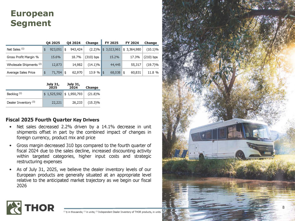 7 Fiscal 2025 Fourth Quarter Key Drivers • Net sales increased 7 . 8 % compared to the prior - year period as an increase in unit shipments of 15 . 9 % was partially offset by a shift in product mix towards our lower - priced product lines and an increase in sales discounting • Gross margin decreased year - over - year primarily due to a favorable LIFO adjustment in the prior - year period along with more aggressive promotional activity in the current period, partially offset by improved operating efficiencies and a lower warranty cost percentage • Independent dealer inventory of THOR Motorized products at July 31 , 2025 decreased both year - over - year and sequentially, positioning channel inventory advantageously heading into our 2026 fiscal year Change FY 2024 FY 2025 Change Q4 2024 Q4 2025 (11.0)% $ 2,445,850 $ 2,175,604 7.8 % $ 517,319 $ 557,412 Net Sales (1) (170) bps 11.4% 9.7% (150) bps 12.8% 11.3% Gross Profit Margin % (8.6)% 18,761 17,153 15.9 % 3,777 4,379 Wholesale Shipments (2) (2.7)% $ 130,369 $ 126,835 (7.1)% $ 136,966 $ 127,292 Average Sales Price July 31, 2025 July 31, 2024 Change 29.3 % $ 776,903 $ 1,004,620 Backlog (1) (10.5)% 10,893 9,747 Dealer Inventory (3) North American Motorized Segment (1) $ in thousands; (2) in units; (3) Independent Dealer Inventory of THOR products, in units