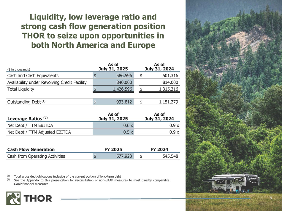 8 Fiscal 2025 Fourth Quarter Key Drivers • Net sales decreased 2 . 2 % driven by a 14 . 1 % decrease in unit shipments offset in part by the combined impact of changes in foreign currency, product mix and price • Gross margin decreased 310 bps compared to the fourth quarter of fiscal 2024 due to the sales decline, increased discounting activity within targeted categories, higher input costs and strategic restructuring expenses • As of July 31 , 2025 , we believe the dealer inventory levels of our European products are generally situated at an appropriate level relative to the anticipated market trajectory as we begin our fiscal 2026 Change FY 2024 FY 2025 Change Q4 2024 Q4 2025 (10.1)% $ 3,364,980 $ 3,023,961 (2.2)% $ 943,424 $ 923,051 Net Sales (1) (210) bps 17.3% 15.2% (310) bps 18.7% 15.6% Gross Profit Margin % (19.7)% 55,317 44,445 (14.1)% 14,982 12,873 Wholesale Shipments (2) 11.8 % $ 60,831 $ 68,038 13.9 % $ 62,970 $ 71,704 Average Sales Price July 31, 2025 July 31, 2024 Change (21.8)% $ 1,950,793 $ 1,525,592 Backlog (1) (15.3)% 26,233 22,221 Dealer Inventory (3) European Segment (1) $ in thousands; (2) in units; (3) Independent Dealer Inventory of THOR products, in units