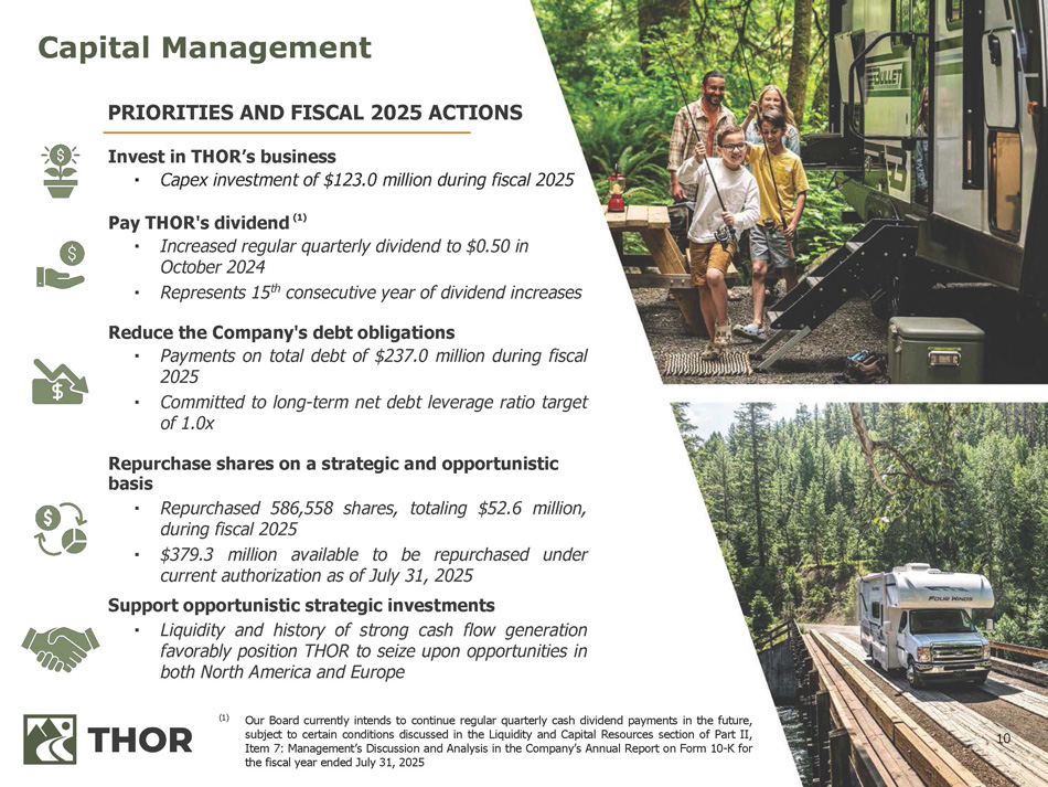 9 ($ in thousands) As of July 31, 2025 As of July 31, 2024 $ 501,316 $ 586,596 Cash and Cash Equivalents 814,000 840,000 Availability under Revolving Credit Facility $ 1,315,316 $ 1,426,596 Total Liquidity $ 1,151,279 $ 933,812 Outstanding Debt (1) Leverage Ratios (2) As of July 31, 2025 As of July 31, 2024 0.9 x 0.6 x Net Debt / TTM EBITDA 0.9 x 0.5 x Net Debt / TTM Adjusted EBITDA Cash Flow Generation FY 2025 FY 2024 $ 545,548 $ 577,923 Cash from Operating Activities (1) (2) Total gross debt obligations inclusive of the current portion of long - term debt See the Appendix to this presentation for reconciliation of non - GAAP measures to most directly comparable GAAP financial measures Liquidity, low leverage ratio and strong cash flow generation position THOR to seize upon opportunities in both North America and Europe
