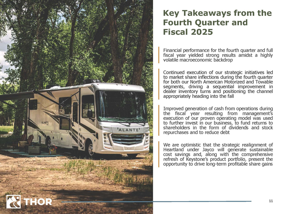 10 Capital Management PRIORITIES AND FISCAL 2025 ACTIONS Invest in THOR’s business ▪ Capex investment of $123.0 million during fiscal 2025 Pay THOR's dividend (1) ▪ Increased regular quarterly dividend to $0.50 in October 2024 ▪ Represents 15 th consecutive year of dividend increases Reduce the Company's debt obligations ▪ Payments on total debt of $237.0 million during fiscal 2025 ▪ Committed to long - term net debt leverage ratio target of 1.0x Repurchase shares on a strategic and opportunistic basis ▪ Repurchased 586 , 558 shares, totaling $ 52 . 6 million, during fiscal 2025 ▪ $ 379 . 3 million available to be repurchased under current authorization as of July 31 , 2025 Support opportunistic strategic investments ▪ Liquidity and history of strong cash flow generation favorably position THOR to seize upon opportunities in both North America and Europe (1) Our Board currently intends to continue regular quarterly cash dividend payments in the future, subject to certain conditions discussed in the Liquidity and Capital Resources section of Part II, Item 7 : Management’s Discussion and Analysis in the Company’s Annual Report on Form 10 - K for the fiscal year ended July 31 , 2025