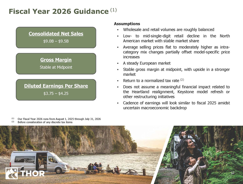 11 Financial performance for the fourth quarter and full fiscal year yielded strong results amidst a highly volatile macroeconomic backdrop Continued execution of our strategic initiatives led to market share inflections during the fourth quarter for both our North American Motorized and Towable segments, driving a sequential improvement in dealer inventory turns and positioning the channel appropriately heading into the fall Improved generation of cash from operations during the fiscal year resulting from management’s execution of our proven operating model was used to further invest in our business, to fund returns to shareholders in the form of dividends and stock repurchases and to reduce debt We are optimistic that the strategic realignment of Heartland under Jayco will generate sustainable cost savings and, along with the comprehensive refresh of Keystone’s product portfolio, present the opportunity to drive long - term profitable share gains Key Takeaways from the Fourth Quarter and Fiscal 2025
