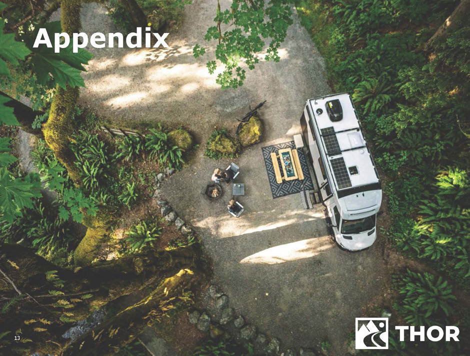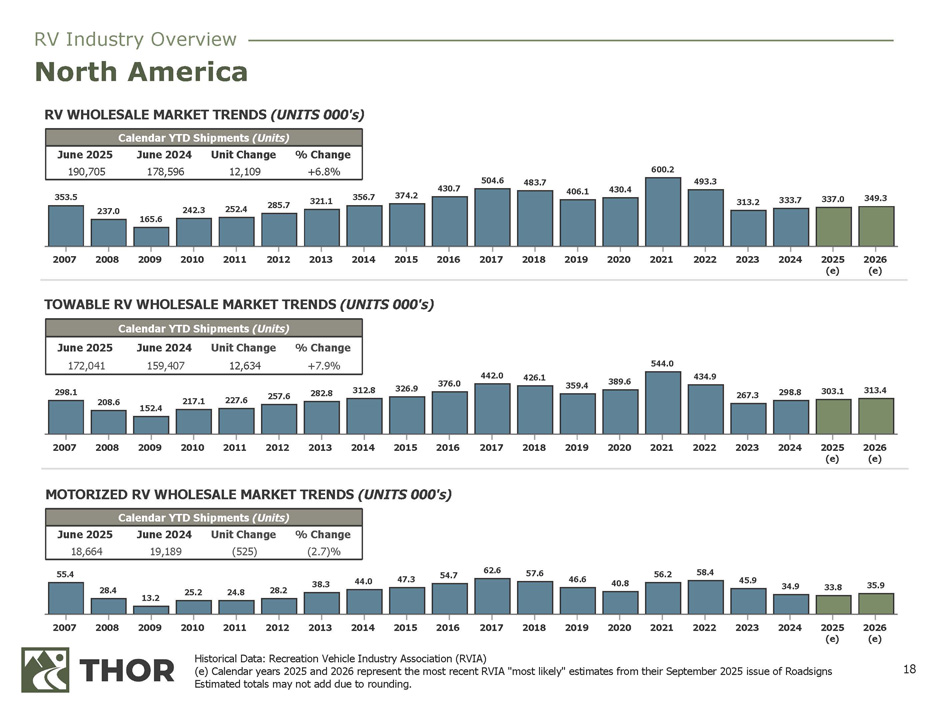 18 55.4 28.4 13.2 25.2 24.8 28.2 38.3 44.0 47.3 54.7 62.6 57.6 46.6 40.8 56.2 58.4 45.9 34.9 33.8 35.9 2007 2008 2009 2010 2011 2012 2013 2014 2015 2016 2017 2018 2019 2020 2021 2022 2023 2024 2025 2026 (e) (e) 298.1 208.6 152.4 217.1 227.6 257.6 282.8 312.8 326.9 376.0 442.0 426.1 359.4 389.6 544.0 434.9 267.3 298.8 303.1 313.4 2026 2025 2024 2023 2022 2021 2020 2019 2018 2017 2016 2015 2014 2013 2012 2011 2010 2009 2008 2007 (e) (e) 353.5 237.0 165.6 242.3 252.4 285.7 321.1 356.7 374.2 430.7 504.6 483.7 406.1 430.4 600.2 493.3 313.2 333.7 337.0 349.3 2026 2025 2024 2023 2022 2021 2020 2019 2018 2017 2016 2015 2014 2013 2012 2011 2010 2009 2008 2007 (e) (e) TOWABLE RV WHOLESALE MARKET TRENDS (UNITS 000's) Calendar YTD Shipments (Units) % Change Unit Change June 2024 June 2025 +6.8% 12,109 178,596 190,705 Calendar YTD Shipments (Units) % Change Unit Change June 2024 June 2025 +7.9% 12,634 159,407 172,041 Calendar YTD Shipments (Units) % Change Unit Change June 2024 June 2025 (2.7)% (525) 19,189 18,664 Historical Data: Recreation Vehicle Industry Association (RVIA) (e) Calendar years 2025 and 2026 represent the most recent RVIA "most likely" estimates from their September 2025 issue of Roadsigns Estimated totals may not add due to rounding. RV Industry Overview North America RV WHOLESALE MARKET TRENDS (UNITS 000's) MOTORIZED RV WHOLESALE MARKET TRENDS (UNITS 000's)