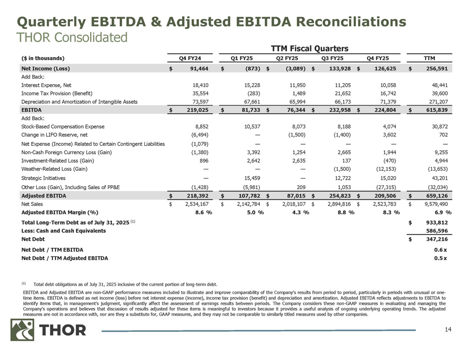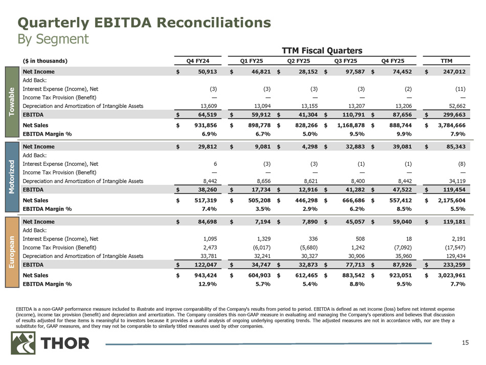 EBITDA and Adjusted EBITDA are non - GAAP performance measures included to illustrate and improve comparability of the Company's results from period to period, particularly in periods with unusual or one - time items . EBITDA is defined as net income (loss) before net interest expense (income), income tax provision (benefit) and depreciation and amortization . Adjusted EBITDA reflects adjustments to EBITDA to identify items that, in management’s judgment, significantly affect the assessment of earnings results between periods . The Company considers these non - GAAP measures in evaluating and managing the Company's operations and believes that discussion of results adjusted for these items is meaningful to investors because it provides a useful analysis of ongoing underlying operating trends . The adjusted measures are not in accordance with, nor are they a substitute for, GAAP measures, and they may not be comparable to similarly titled measures used by other companies . 14 Quarterly EBITDA & Adjusted EBITDA Reconciliations THOR Consolidated TTM Q4 FY25 Q3 FY25 Q2 FY25 Q1 FY25 Q4 FY24 ($ in thousands) $ 256,591 $ 126,625 $ 133,928 $ (3,089) $ (873) $ 91,464 Net Income (Loss) 48,441 10,058 11,205 11,950 15,228 18,410 Add Back: Interest Expense, Net 39,600 16,742 21,652 1,489 (283) 35,554 Income Tax Provision (Benefit) 271,207 71,379 66,173 65,994 67,661 73,597 Depreciation and Amortization of Intangible Assets $ 615,839 $ 224,804 $ 232,958 $ 76,344 $ 81,733 $ 219,025 EBITDA 30,872 4,074 8,188 8,073 10,537 8,852 Add Back: Stock - Based Compensation Expense 702 3,602 (1,400) (1,500) — (6,494) Change in LIFO Reserve, net — — — — — (1,079) Net Expense (Income) Related to Certain Contingent Liabilities 9,255 1,944 2,665 1,254 3,392 (1,380) Non - Cash Foreign Currency Loss (Gain) 4,944 (470) 137 2,635 2,642 896 Investment - Related Loss (Gain) (13,653) (12,153) (1,500) — — — Weather - Related Loss (Gain) 43,201 15,020 12,722 — 15,459 — Strategic Initiatives (32,034) (27,315) 1,053 209 (5,981) (1,428) Other Loss (Gain), Including Sales of PP&E $ 659,126 $ 209,506 $ 254,823 $ 87,015 $ 107,782 $ 218,392 Adjusted EBITDA $ 9,579,490 $ 2,523,783 $ 2,894,816 $ 2,018,107 $ 2,142,784 $ 2,534,167 Net Sales 6.9 % 8.3 % 8.8 % 4.3 % 5.0 % 8.6 % Adjusted EBITDA Margin (%) $ 933,812 Total Long - Term Debt as of July 31, 2025 (1) 586,596 Less: Cash and Cash Equivalents $ 347,216 Net Debt 0.6 x 0.5 x Net Debt / TTM EBITDA Net Debt / TTM Adjusted EBITDA TTM Fiscal Quarters (1) Total debt obligations as of July 31, 2025 inclusive of the current portion of long - term debt.