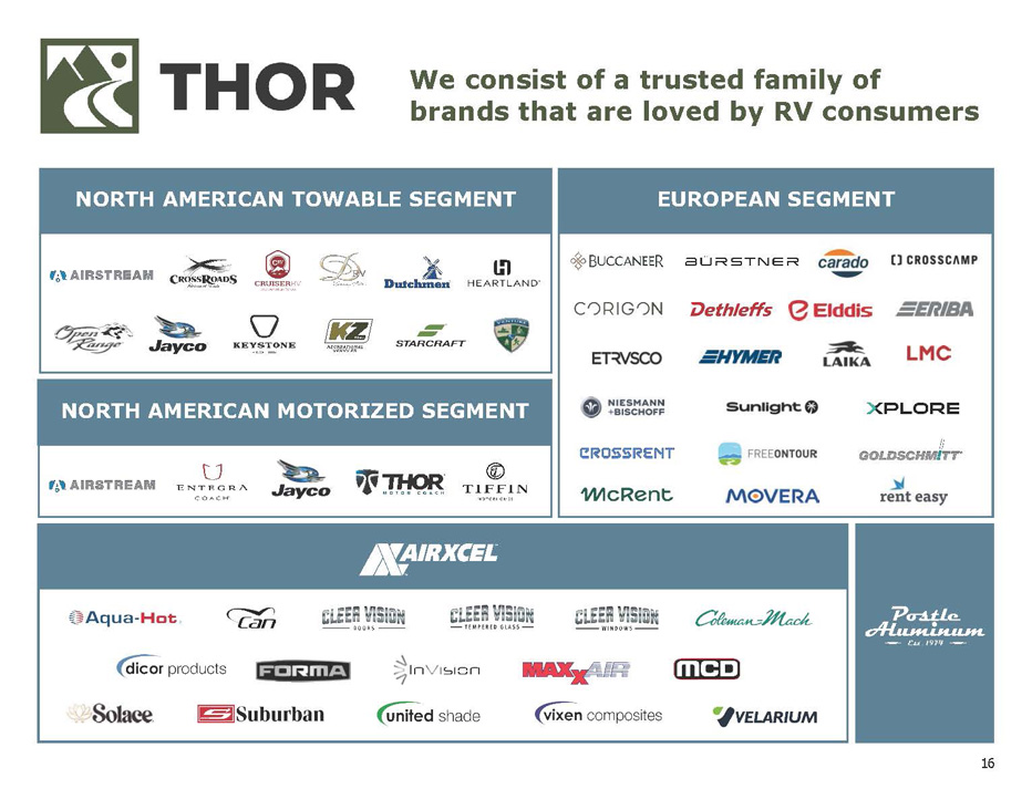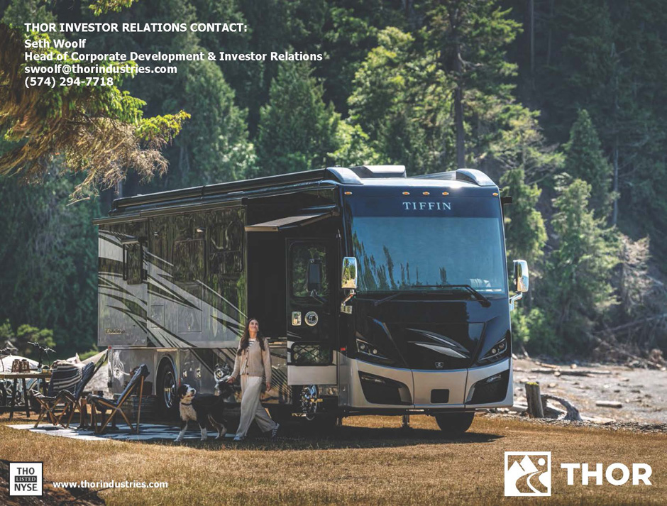 www.thorindustries.com THOR INVESTOR RELATIONS CONTACT: Seth Woolf Head of Corporate Development & Investor Relations swoolf@thorindustries.com (574) 294 - 7718