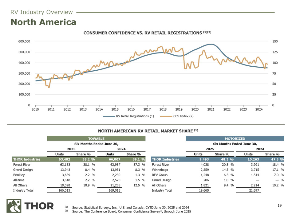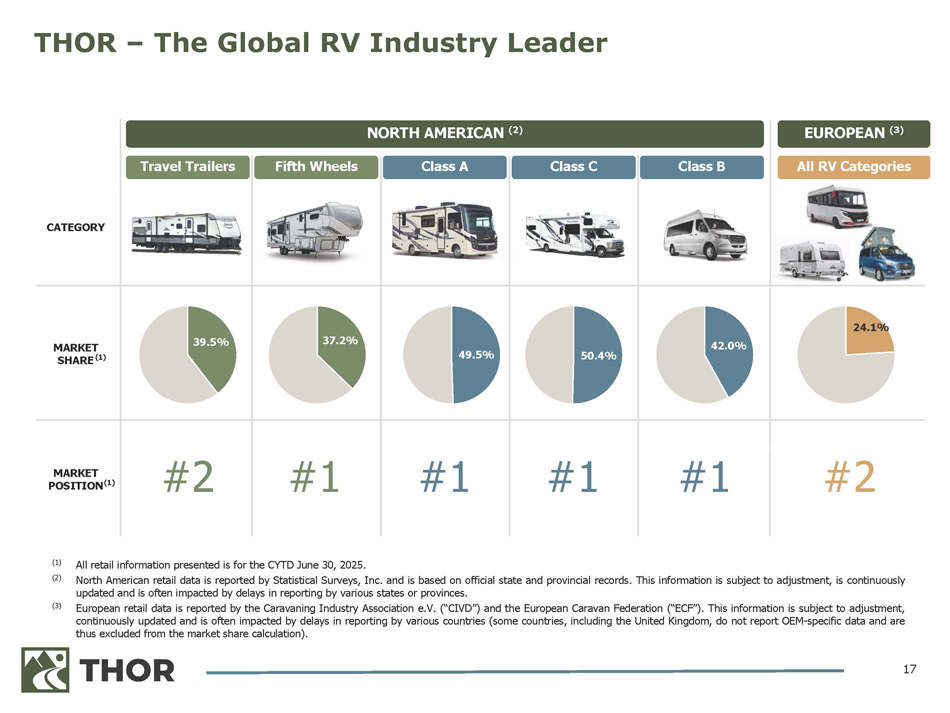 17 (1) (2) All retail information presented is for the CYTD June 30 , 2025 . North American retail data is reported by Statistical Surveys, Inc . and is based on official state and provincial records . This information is subject to adjustment, is continuously updated and is often impacted by delays in reporting by various states or provinces . European retail data is reported by the Caravaning Industry Association e . V . (“CIVD”) and the European Caravan Federation (“ECF ” ) . This information is subject to adjustment, continuously updated and is often impacted by delays in reporting by various countries (some countries, including the United Kingdom, do not report OEM - specific data and are thus excluded from the market share calculation) . (3) EUROPEAN (3) All RV Categories NORTH AMERICAN (2) CATEGORY Class B Class C Class A Fifth Wheels Travel Trailers 24.1% 42.0% 50.4% 49.5% 37.2% 39.5% MARKET SHARE (1) #2 #1 #1 #1 #1 #2 MARKET POSITION (1) THOR – The Global RV Industry Leader