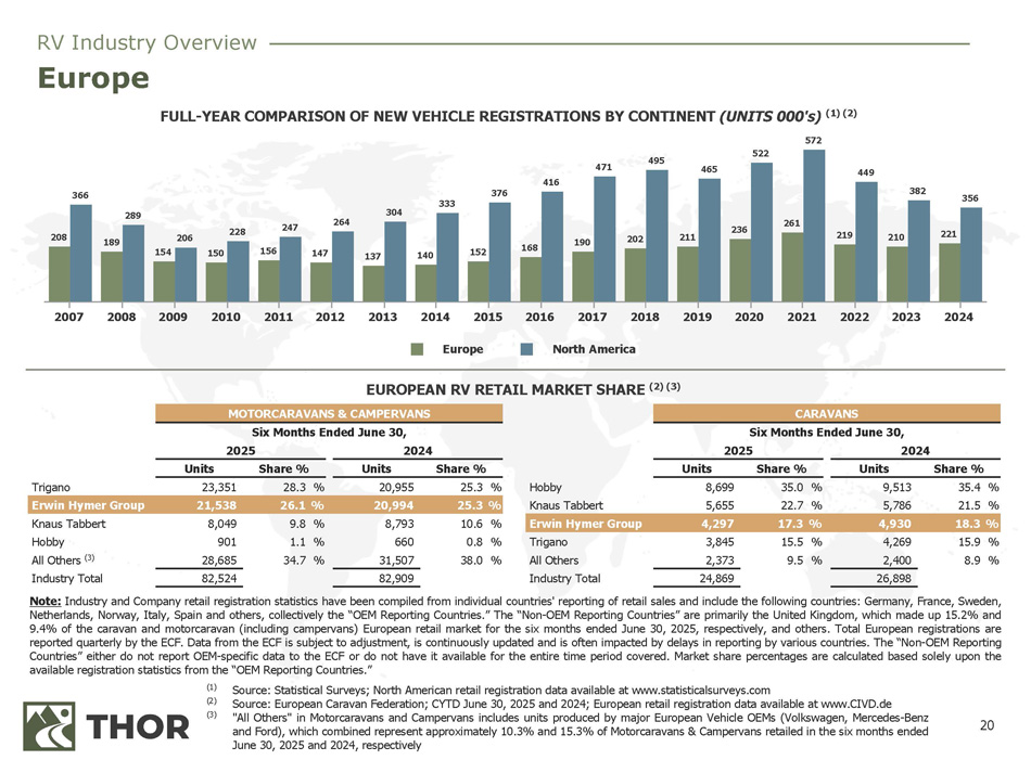 19 NORTH AMERICAN RV RETAIL MARKET SHARE (1) 2015 2016 2017 RV Retail Registrations (1) 2019 2020 CCS Index (2) 2010 2011 2012 2013 2014 2018 2021 2022 2023 2024 0 100,000 200,000 300,000 400,000 500,000 600,000 0 25 50 75 100 125 150 (1) (2) Source: Statistical Surveys, Inc., U.S. and Canada; CYTD June 30, 2025 and 2024 Source: The Conference Board, Consumer Confidence Survey ® , through June 2025 CONSUMER CONFIDENCE VS. RV RETAIL REGISTRATIONS (1)(2) 47.3 % 10,263 48.3 % 9,493 THOR Industries 39.1 % 66,007 38.2 % 63,482 THOR Industries % 18.4 3,991 % 20.5 4,038 Forest River % 37.3 62,987 % 38.1 63,183 Forest River % 17.1 3,715 % 14.5 2,859 Winnebago % 8.3 13,981 % 8.4 13,943 Grand Design % 7.0 1,514 % 6.3 1,248 REV Group % 1.3 2,230 % 2.2 3,689 Brinkley % — — % 1.0 206 Grand Design % 1.5 2,573 % 2.2 3,618 Alliance % 10.2 2,214 % 9.4 1,821 All Others % 12.5 21,235 % 10.9 18,098 All Others 21,697 19,665 Industry Total 169,013 166,013 Industry Total TOWABLE Six Months Ended June 30, 2025 2024 Units Share % Units Share % MOTORIZED Six Months Ended June 30, 2025 2024 Units Share % Units Share % North America RV Industry Overview