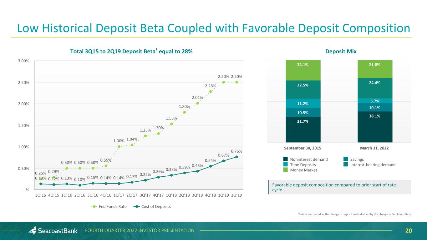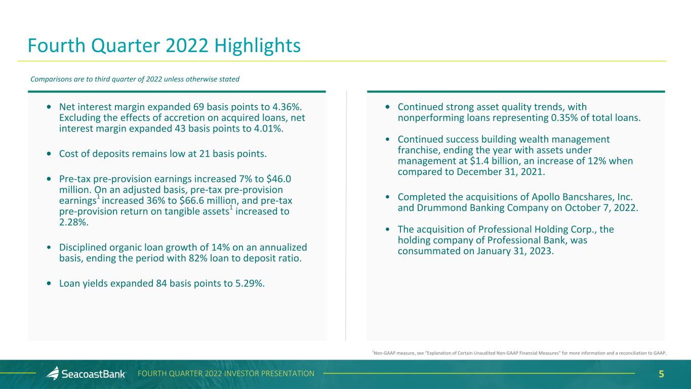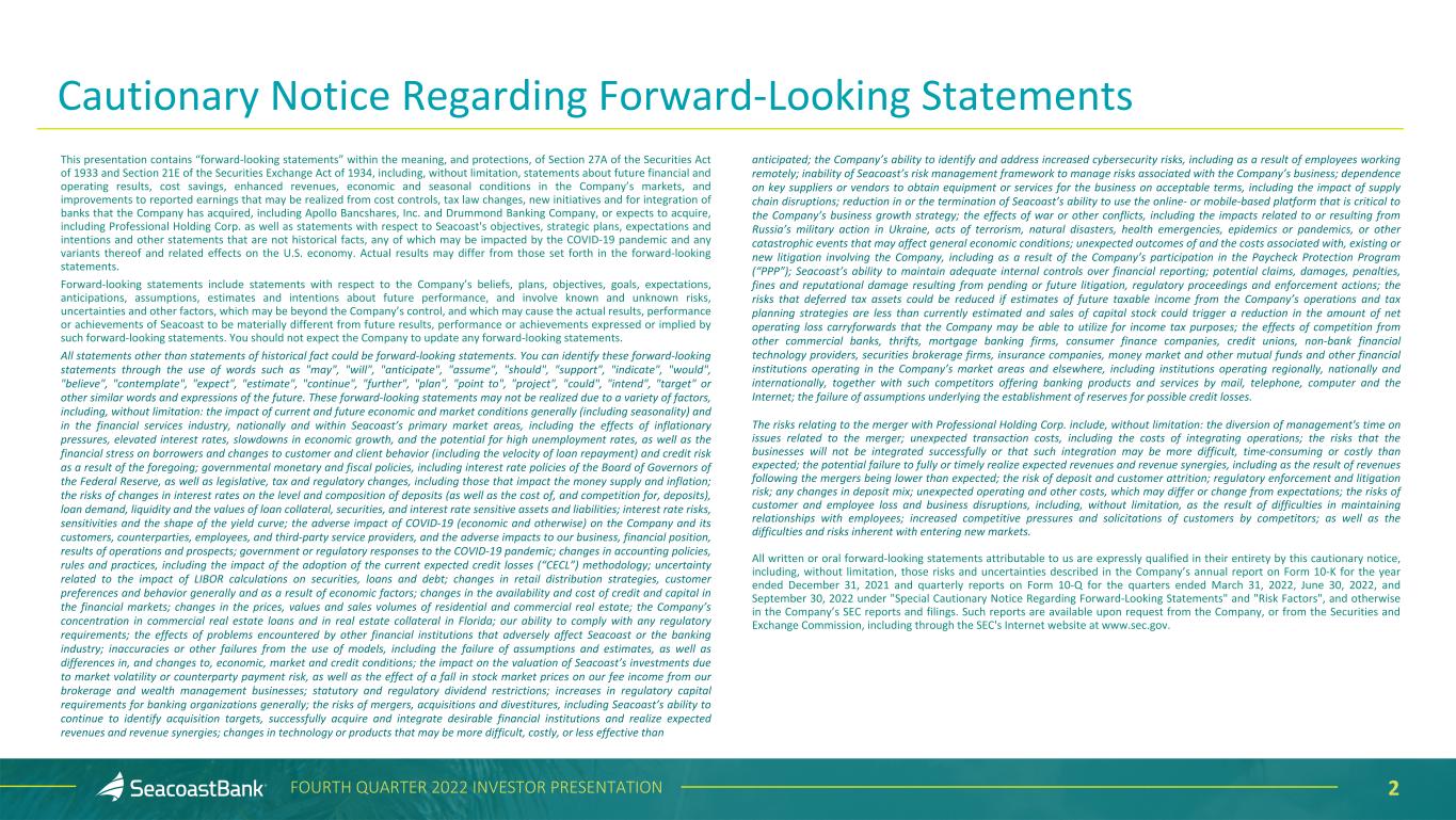 2FOURTH QUARTER 2022 INVESTOR PRESENTATION This presentation contains “forward-looking statements” within the meaning, and protections, of Section 27A of the Securities Act of 1933 and Section 21E of the Securities Exchange Act of 1934, including, without limitation, statements about future financial and operating results, cost savings, enhanced revenues, economic and seasonal conditions in the Company’s markets, and improvements to reported earnings that may be realized from cost controls, tax law changes, new initiatives and for integration of banks that the Company has acquired, including Apollo Bancshares, Inc. and Drummond Banking Company, or expects to acquire, including Professional Holding Corp. as well as statements with respect to Seacoast's objectives, strategic plans, expectations and intentions and other statements that are not historical facts, any of which may be impacted by the COVID-19 pandemic and any variants thereof and related effects on the U.S. economy. Actual results may differ from those set forth in the forward-looking statements. Forward-looking statements include statements with respect to the Company’s beliefs, plans, objectives, goals, expectations, anticipations, assumptions, estimates and intentions about future performance, and involve known and unknown risks, uncertainties and other factors, which may be beyond the Company’s control, and which may cause the actual results, performance or achievements of Seacoast to be materially different from future results, performance or achievements expressed or implied by such forward-looking statements. You should not expect the Company to update any forward-looking statements. All statements other than statements of historical fact could be forward-looking statements. You can identify these forward-looking statements through the use of words such as "may", "will", "anticipate", "assume", "should", "support", "indicate", "would", "believe", "contemplate", "expect", "estimate", "continue", "further", "plan", "point to", "project", "could", "intend", "target" or other similar words and expressions of the future. These forward-looking statements may not be realized due to a variety of factors, including, without limitation: the impact of current and future economic and market conditions generally (including seasonality) and in the financial services industry, nationally and within Seacoast’s primary market areas, including the effects of inflationary pressures, elevated interest rates, slowdowns in economic growth, and the potential for high unemployment rates, as well as the financial stress on borrowers and changes to customer and client behavior (including the velocity of loan repayment) and credit risk as a result of the foregoing; governmental monetary and fiscal policies, including interest rate policies of the Board of Governors of the Federal Reserve, as well as legislative, tax and regulatory changes, including those that impact the money supply and inflation; the risks of changes in interest rates on the level and composition of deposits (as well as the cost of, and competition for, deposits), loan demand, liquidity and the values of loan collateral, securities, and interest rate sensitive assets and liabilities; interest rate risks, sensitivities and the shape of the yield curve; the adverse impact of COVID-19 (economic and otherwise) on the Company and its customers, counterparties, employees, and third-party service providers, and the adverse impacts to our business, financial position, results of operations and prospects; government or regulatory responses to the COVID-19 pandemic; changes in accounting policies, rules and practices, including the impact of the adoption of the current expected credit losses (“CECL”) methodology; uncertainty related to the impact of LIBOR calculations on securities, loans and debt; changes in retail distribution strategies, customer preferences and behavior generally and as a result of economic factors; changes in the availability and cost of credit and capital in the financial markets; changes in the prices, values and sales volumes of residential and commercial real estate; the Company’s concentration in commercial real estate loans and in real estate collateral in Florida; our ability to comply with any regulatory requirements; the effects of problems encountered by other financial institutions that adversely affect Seacoast or the banking industry; inaccuracies or other failures from the use of models, including the failure of assumptions and estimates, as well as differences in, and changes to, economic, market and credit conditions; the impact on the valuation of Seacoast’s investments due to market volatility or counterparty payment risk, as well as the effect of a fall in stock market prices on our fee income from our brokerage and wealth management businesses; statutory and regulatory dividend restrictions; increases in regulatory capital requirements for banking organizations generally; the risks of mergers, acquisitions and divestitures, including Seacoast’s ability to continue to identify acquisition targets, successfully acquire and integrate desirable financial institutions and realize expected revenues and revenue synergies; changes in technology or products that may be more difficult, costly, or less effective than anticipated; the Company’s ability to identify and address increased cybersecurity risks, including as a result of employees working remotely; inability of Seacoast’s risk management framework to manage risks associated with the Company’s business; dependence on key suppliers or vendors to obtain equipment or services for the business on acceptable terms, including the impact of supply chain disruptions; reduction in or the termination of Seacoast’s ability to use the online- or mobile-based platform that is critical to the Company’s business growth strategy; the effects of war or other conflicts, including the im