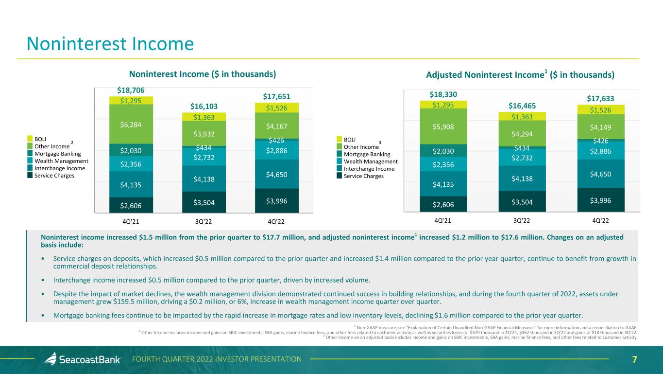 6FOURTH QUARTER 2022 INVESTOR PRESENTATION Significant Expansion in Net Interest Margin and Net Interest Income ($ in th ou sa nd s) $72,412 $76,639 $81,764 $88,399 $119,858 3.16% 3.25% 3.38% 3.67% 4.36% 2.91% 3.05% 3.24% 3.57% 4.01% Net Interest Income Net Interest Margin NIM, excluding PPP and accretion on acquired loans 4Q'21 1Q'22 2Q'22 3Q'22 4Q'22 • Net interest income1 totaled $119.9 million, an increase of $31.5 million, or 36%, from the prior quarter. • Net interest margin expanded 69 basis points to 4.36% and, excluding the effect of accretion on acquired loans, net interest margin increased 43 basis points to 4.01%. • Securities yields expanded 41 basis points to 2.77%, reflecting the increasing rate environment. • Loan yields expanded 84 basis points to 5.29%, benefiting from $649.2 million in loan originations during the fourth quarter of 2022. • Cost of deposits at 21 basis points. 1Calculated on a fully taxable equivalent basis using amortized cost.