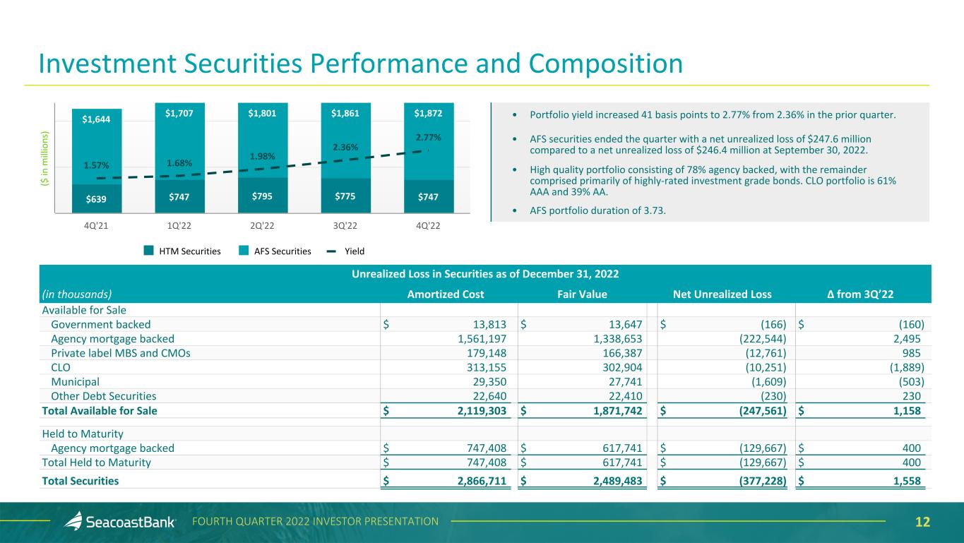 11FOURTH QUARTER 2022 INVESTOR PRESENTATION $5,925 $6,451 $6,542 $6,691 $8,145 4.31% 4.30% 4.29% 4.45% 5.29% 3.94% 4.00% 4.10% 4.30% 4.80% Yield Excluding PPP and Accretion on Acquired Loans Reported Yield Total Loans 4Q'21 1Q'22 2Q'22 3Q'22 4Q'22 Total Loans End-of-Period ($ in millions) Disciplined Approach to Lending in a Strong Florida Economy Loans outstanding, excluding acquisitions, increased $240.8 million, or 14% annualized. Total loan originations were $649 million, including $490 million in commercial originations. Loan yields excluding accretion on acquired loans expanded to 4.80%. The weighted average add-on rate for loan outstandings increased to 6.52% by the end of the fourth quarter.