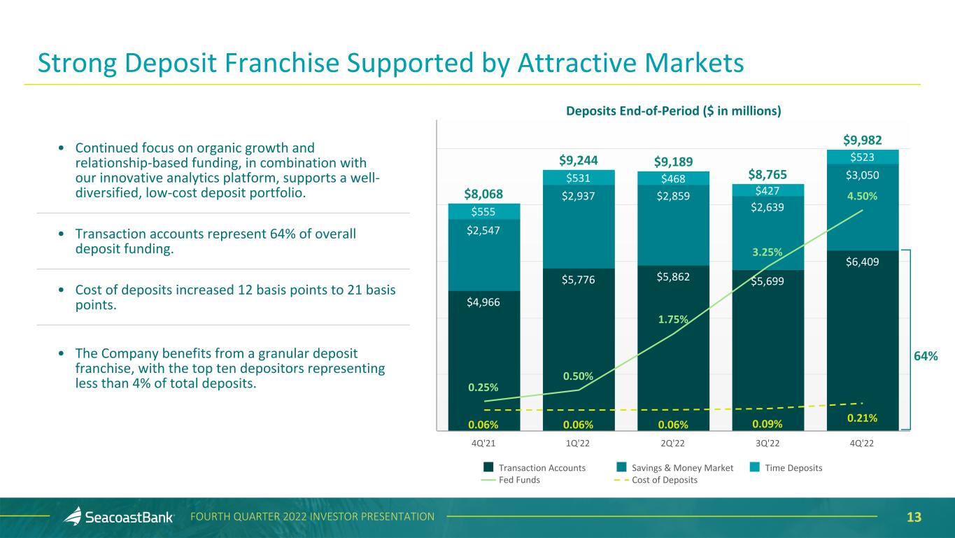 12FOURTH QUARTER 2022 INVESTOR PRESENTATION Investment Securities Performance and Composition Unrealized Loss in Securities as of December 31, 2022 (in thousands) Amortized Cost Fair Value Net Unrealized Loss Δ from 3Q’22 Available for Sale Government backed $ 13,813 $ 13,647 $ (166) $ (160) Agency mortgage backed 1,561,197 1,338,653 (222,544) 2,495 Private label MBS and CMOs 179,148 166,387 (12,761) 985 CLO 313,155 302,904 (10,251) (1,889) Municipal 29,350 27,741 (1,609) (503) Other Debt Securities 22,640 22,410 (230) 230 Total Available for Sale $ 2,119,303 $ 1,871,742 $ (247,561) $ 1,158 Held to Maturity Agency mortgage backed $ 747,408 $ 617,741 $ (129,667) $ 400 Total Held to Maturity $ 747,408 $ 617,741 $ (129,667) $ 400 Total Securities $ 2,866,711 $ 2,489,483 $ (377,228) $ 1,558 ($ in m ill io ns ) $639 $747 $795 $775 $747 $1,644 $1,707 $1,801 $1,861 $1,872 1.57% 1.68% 1.98% 2.36% 2.77% HTM Securities AFS Securities Yield 4Q'21 1Q'22 2Q'22 3Q'22 4Q'22 • Portfolio yield increased 41 basis points to 2.77% from 2.36% in the prior quarter. • AFS securities ended the quarter with a net unrealized loss of $247.6 million compared to a net unrealized loss of $246.4 million at September 30, 2022. • High quality portfolio consisting of 78% agency backed, with the remainder comprised primarily of highly-rated investment grade bonds. CLO portfolio is 61% AAA and 39% AA. • AFS portfolio duration of 3.73.