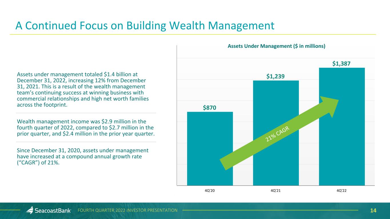 13FOURTH QUARTER 2022 INVESTOR PRESENTATION 64% Deposits End-of-Period ($ in millions) $8,068 $9,244 $9,189 $8,765 $9,982 $4,966 $5,776 $5,862 $5,699 $6,409 $2,547 $2,937 $2,859 $2,639 $3,050 $555 $531 $468 $427 $523 0.25% 0.50% 1.75% 3.25% 4.50% 0.06% 0.06% 0.06% 0.09% 0.21% Transaction Accounts Savings & Money Market Time Deposits Fed Funds Cost of Deposits 4Q'21 1Q'22 2Q'22 3Q'22 4Q'22 Strong Deposit Franchise Supported by Attractive Markets • Continued focus on organic growth and relationship-based funding, in combination with our innovative analytics platform, supports a well- diversified, low-cost deposit portfolio. • Transaction accounts represent 64% of overall deposit funding. • Cost of deposits increased 12 basis points to 21 basis points. • The Company benefits from a granular deposit franchise, with the top ten depositors representing less than 4% of total deposits.