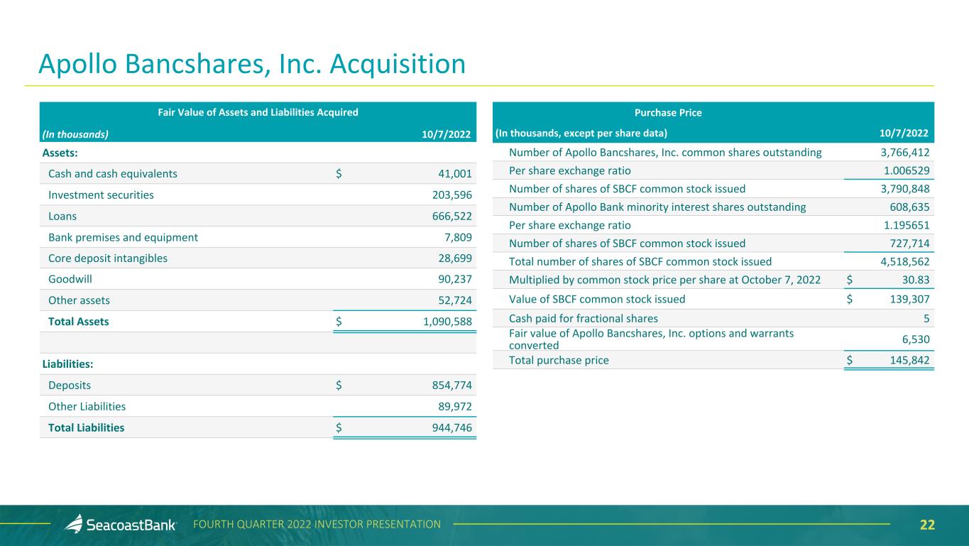 22FOURTH QUARTER 2022 INVESTOR PRESENTATION Fair Value of Assets and Liabilities Acquired (In thousands) 10/7/2022 Assets: Cash and cash equivalents $ 41,001 Investment securities 203,596 Loans 666,522 Bank premises and equipment 7,809 Core deposit intangibles 28,699 Goodwill 90,237 Other assets 52,724 Total Assets $ 1,090,588 Liabilities: Deposits $ 854,774 Other Liabilities 89,972 Total Liabilities $ 944,746 Apollo Bancshares, Inc. Acquisition Purchase Price (In thousands, except per share data) 10/7/2022 Number of Apollo Bancshares, Inc. common shares outstanding 3,766,412 Per share exchange ratio 1.006529 Number of shares of SBCF common stock issued 3,790,848 Number of Apollo Bank minority interest shares outstanding 608,635 Per share exchange ratio 1.195651 Number of shares of SBCF common stock issued 727,714 Total number of shares of SBCF common stock issued 4,518,562 Multiplied by common stock price per share at October 7, 2022 $ 30.83 Value of SBCF common stock issued $ 139,307 Cash paid for fractional shares 5 Fair value of Apollo Bancshares, Inc. options and warrants converted 6,530 Total purchase price $ 145,842