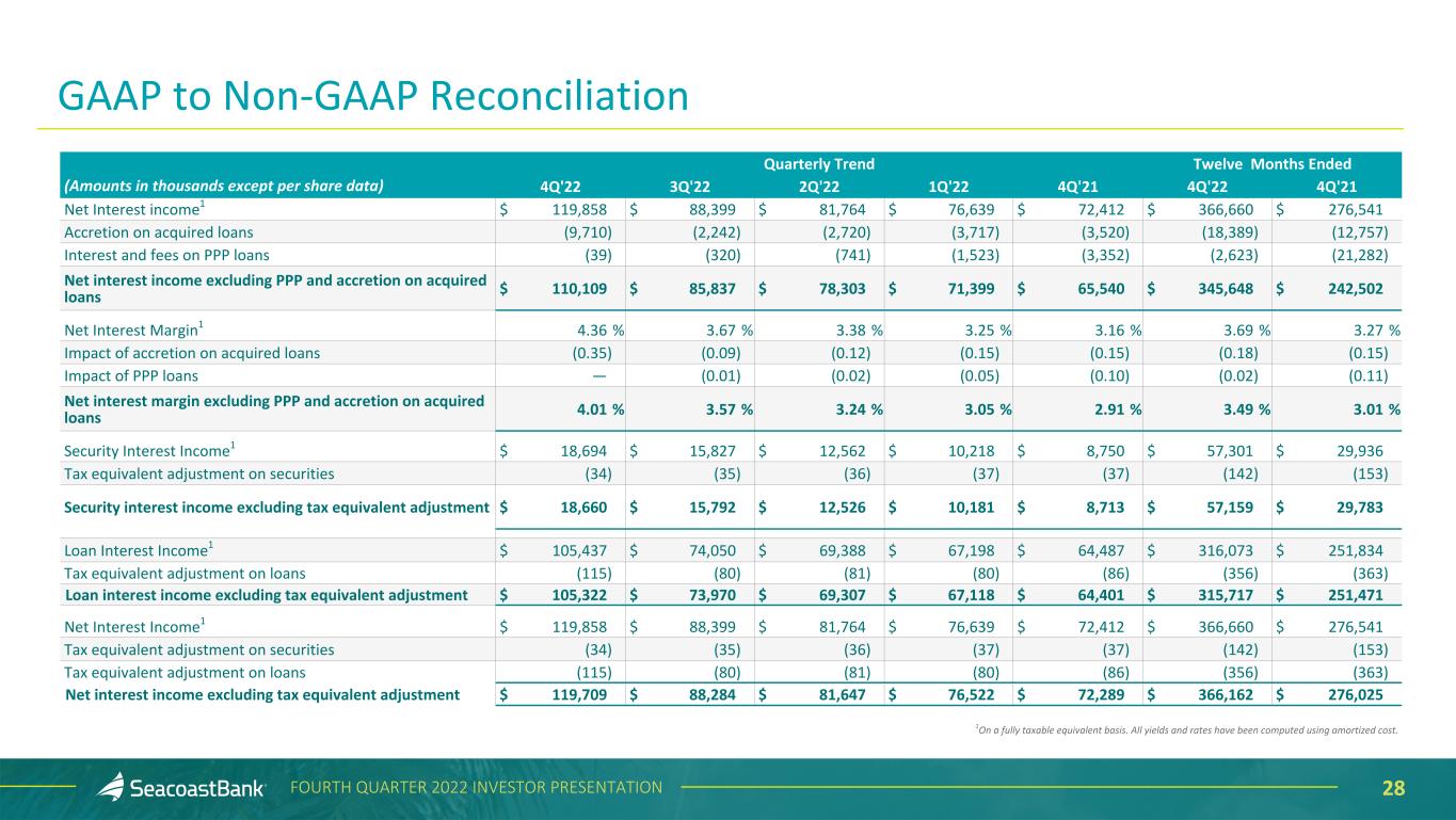 27FOURTH QUARTER 2022 INVESTOR PRESENTATION Quarterly Trend Twelve Months Ended (Amounts in thousands except per share data) 4Q'22 3Q'22 2Q'22 1Q'22 4Q'21 4Q'22 4Q'21 Return on Average Assets (ROA) 0.78 % 1.10 % 1.21 % 0.79 % 1.43 % 0.96 % 1.33 % Impact of removing average intangible assets and related amortization 0.16 0.07 0.08 0.06 0.08 0.10 0.08 Return on Average Tangible Assets (ROTA) 0.94 1.17 1.29 0.85 1.51 1.06 1.41 Impact of other adjustments for Adjusted Net Income 0.42 0.10 0.09 0.21 (0.02) 0.21 0.07 Adjusted Return on Average Tangible Assets 1.36 1.27 1.38 1.06 1.49 1.27 1.48 Average Shareholders' Equity $ 1,573,704 $ 1,349,475 $ 1,350,568 $ 1,400,535 $ 1,303,686 $ 1,418,855 $ 1,215,312 Less average goodwill and intangible assets (521,412) (305,935) (307,411) (304,321) (267,692) (360,217) (249,089) Average Tangible Equity $ 1,052,292 $ 1,043,540 $ 1,043,157 $ 1,096,214 $ 1,035,994 $ 1,058,638 $ 966,223 Return on Average Shareholders' Equity 6.03 % 8.60 % 9.73 % 5.96 % 11.06 % 7.51 % 10.24 % Impact of removing average intangible assets and related amortization 4.33 2.93 3.28 2.06 3.23 3.19 3.03 Return on Average Tangible Common Equity (ROTCE) 10.36 11.53 13.01 8.02 14.29 10.70 13.27 Impact of other adjustments for Adjusted Net Income 4.69 0.95 0.96 1.99 (0.18) 2.16 0.70 Adjusted Return on Average Tangible Common Equity 15.05 12.48 13.97 10.01 14.11 12.86 13.97 Loan Interest Income1 $ 105,437 $ 74,050 $ 69,388 $ 67,198 $ 64,487 $ 316,073 $ 251,834 Accretion on acquired loans (9,710) (2,242) (2,720) (3,717) (3,520) (18,389) (12,757) Interest and fees on PPP loans (39) (320) (741) (1,523) (3,352) (2,623) (21,282) Loan interest income excluding PPP and accretion on acquired loans $ 95,688 $ 71,488 $ 65,927 $ 61,958 $ 57,615 $ 295,061 $ 217,795 Yield on Loans1 5.29 % 4.45 % 4.29 % 4.30 % 4.31 % 4.62 % 4.38 % Impact of accretion on acquired loans (0.49) (0.14) (0.16) (0.24) (0.24) (0.27) (0.22) Impact of PPP loans 0.00 (0.01) (0.03) (0.06) (0.13) (0.02) (0.10) Yield on loans excluding PPP and accretion on acquired loans 4.80 % 4.30 % 4.10 % 4.00 % 3.94 % 4.33 % 4.06 % 1On a fully taxable equivalent basis. All yields and rates have been computed using amortized cost. GAAP to Non-GAAP Reconciliation