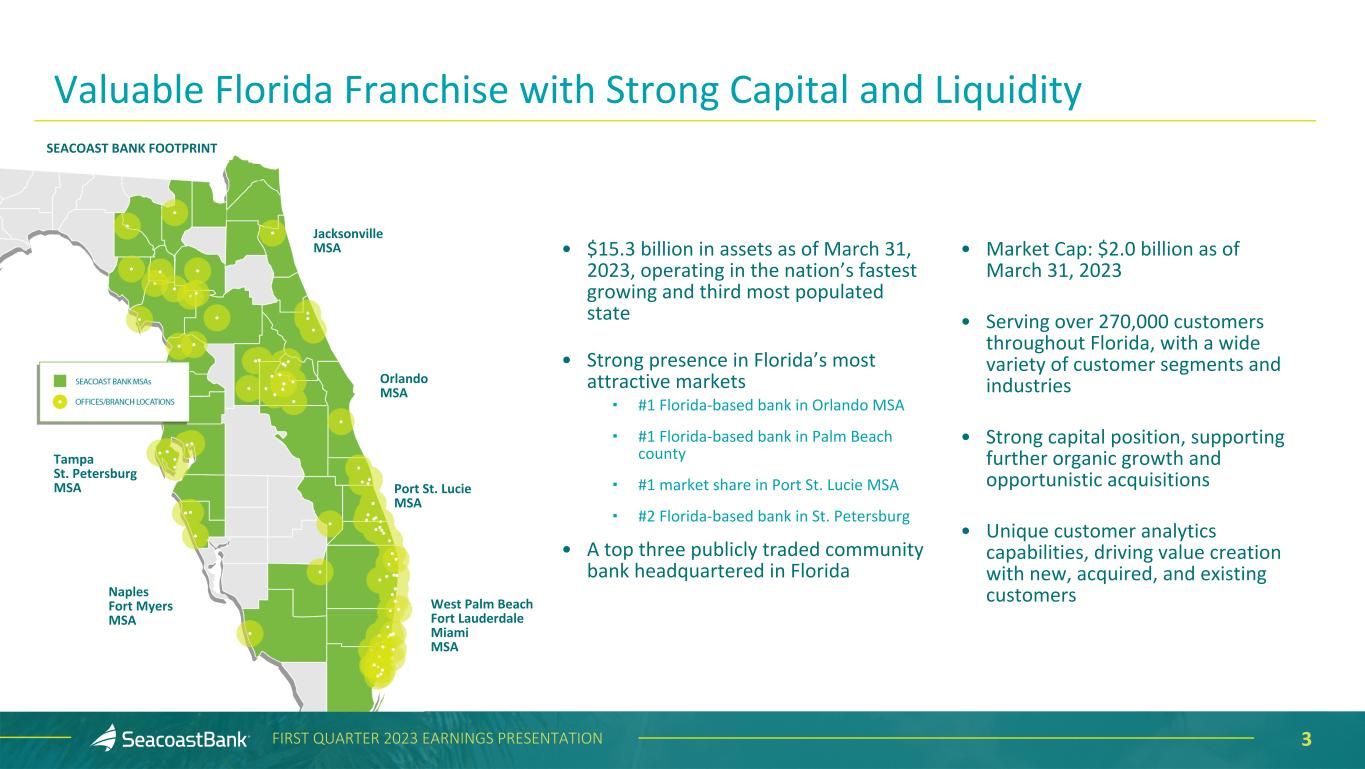 2FIRST QUARTER 2023 EARNINGS PRESENTATION This presentation contains “forward-looking statements” within the meaning, and protections, of Section 27A of the Securities Act of 1933, as amended, and Section 21E of the Securities Exchange Act of 1934, as amended, including, without limitation, statements about future financial and operating results, cost savings, enhanced revenues, economic and seasonal conditions in the Company’s markets, and improvements to reported earnings that may be realized from cost controls, tax law changes, new initiatives and for integration of banks that the Company has acquired, including Professional Holding Corp., or expects to acquire, as well as statements with respect to Seacoast's objectives, strategic plans, expectations and intentions and other statements that are not historical facts. Actual results may differ from those set forth in the forward-looking statements. Forward-looking statements include statements with respect to the Company’s beliefs, plans, objectives, goals, expectations, anticipations, assumptions, estimates and intentions about future performance, and involve known and unknown risks, uncertainties and other factors, which may be beyond the Company’s control, and which may cause the actual results, performance or achievements of Seacoast Banking Corporation of Florida (“Seacoast” or the “Company”) or its wholly-owned banking subsidiary, Seacoast National Bank (“Seacoast Bank”), to be materially different from future results, performance or achievements expressed or implied by such forward-looking statements. You should not expect the Company to update any forward-looking statements. All statements other than statements of historical fact could be forward-looking statements. You can identify these forward-looking statements through the use of words such as "may", "will", "anticipate", "assume", "should", "support", "indicate", "would", "believe", "contemplate", "expect", "estimate", "continue", "further", "plan", "point to", "project", "could", "intend", "target" or other similar words and expressions of the future. These forward-looking statements may not be realized due to a variety of factors, including, without limitation: the impact of current and future economic and market conditions generally (including seasonality) and in the financial services industry, nationally and within Seacoast’s primary market areas, including the effects of inflationary pressures, changes in interest rates, slowdowns in economic growth, and the potential for high unemployment rates, as well as the financial stress on borrowers and changes to customer and client behavior (including the velocity of loan repayment) and credit risk as a result of the foregoing; potential impacts of the recent adverse developments in the banking industry highlighted by high-profile bank failures, including impacts on customer confidence, deposit outflows, liquidity and the regulatory response thereto; governmental monetary and fiscal policies, including interest rate policies of the Board of Governors of the Federal Reserve, as well as legislative, tax and regulatory changes, including those that impact the money supply and inflation and the possibility that the U.S. could default on its debt obligations; the risks of changes in interest rates on the level and composition of deposits (as well as the cost of, and competition for, deposits), loan demand, liquidity and the values of loan collateral, securities, and interest rate sensitive assets and liabilities; interest rate risks, sensitivities and the shape of the yield curve; changes in accounting policies, rules and practices; changes in retail distribution strategies, customer preferences and behavior generally and as a result of economic factors; changes in the availability and cost of credit and capital in the financial markets; changes in the prices, values and sales volumes of residential and commercial real estate; the Company’s concentration in commercial real estate loans and in real estate collateral in Florida; Seacoast’s ability to comply with any regulatory requirements; the effects of problems encountered by other financial institutions that adversely affect Seacoast or the banking industry; inaccuracies or other failures from the use of models, including the failure of assumptions and estimates, as well as differences in, and changes to, economic, market and credit conditions; the impact on the valuation of Seacoast’s investments due to market volatility or counterparty payment risk, as well as the effect of a decline in stock market prices on our fee income from our wealth management business; statutory and regulatory dividend restrictions; increases in regulatory capital requirements for banking organizations generally; the risks of mergers, acquisitions and divestitures, including Seacoast’s ability to continue to identify acquisition targets, successfully acquire and integrate desirable financial institutions and realize expected revenues and revenue synergies; changes in technology or products that may be more difficult, costly, or less effective than anticipated; the Company’s ability to identify and address increased cybersecurity risks; fraud or misconduct by internal or external, which Seacoast may not be able to prevent, detect or mitigate; inability of Seacoast’s risk management framework to manage risks associated with the Company’s business; dependence on key suppliers or vendors to obtain equipment or services for the business on acceptable terms, including the impact of supply chain disruptions; reduction in or the termination of Seacoast’s ability to use the online- or mobile-based platform that is critical to the Company’s business growth strategy; the effects of war or other conflicts, including the impacts related to or resulting from Russia’s military action in Ukraine, acts of terrorism, natural disasters, including hurricanes in the Company’s