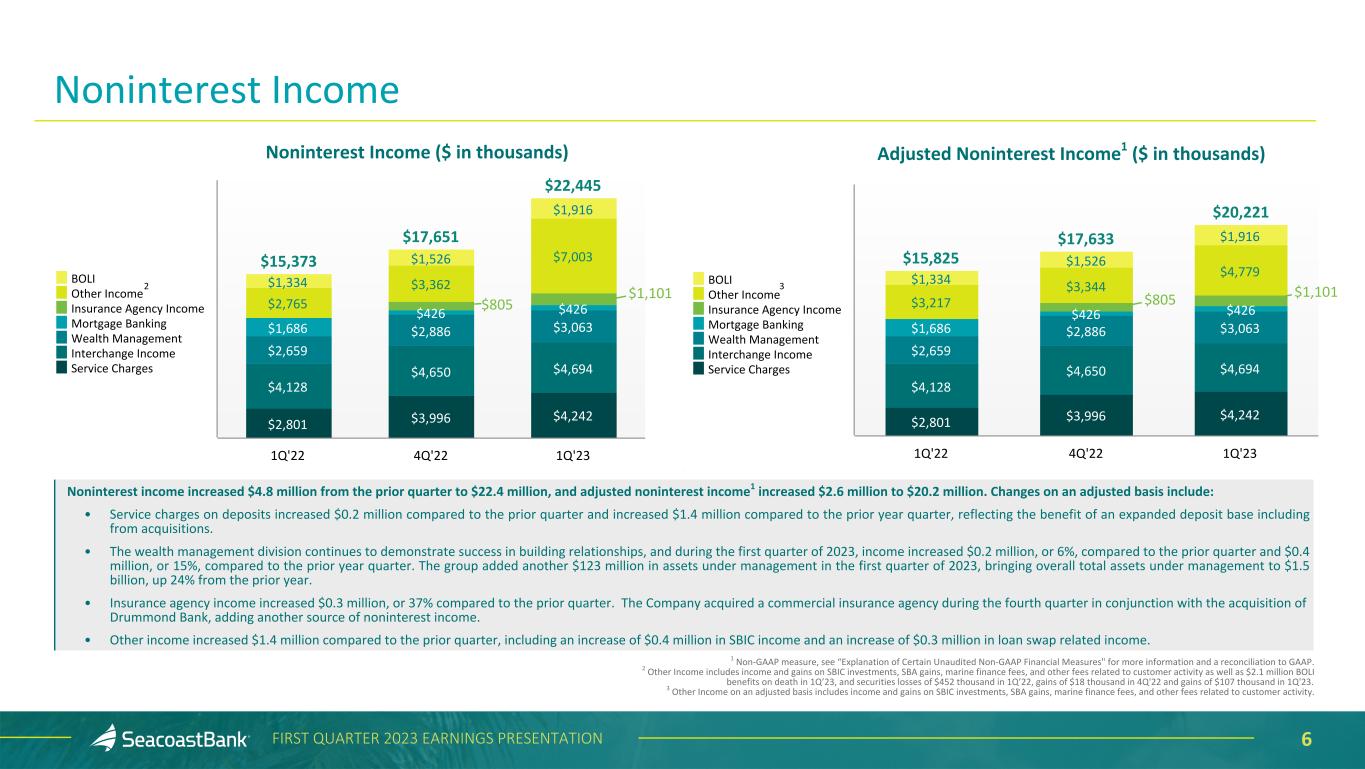 5FIRST QUARTER 2023 EARNINGS PRESENTATION Continued Growth in Net Interest Income ($ in th ou sa nd s) $76,639 $81,764 $88,399 $119,858 $131,351 3.25% 3.38% 3.67% 4.36% 4.31% 3.10% 3.26% 3.58% 4.01% 3.78% Net Interest Income Net Interest Margin NIM, excluding accretion on acquired loans 1Q'22 2Q'22 3Q'22 4Q'22 1Q'23 • Net interest income1 totaled $131.4 million, an increase of $11.5 million, or 10%, from the prior quarter. • Net interest margin contracted five basis points to 4.31% and, excluding the effect of accretion on acquired loans, net interest margin contracted to 3.78%. The decline in the net interest margin from prior quarter was driven by the continued effect of an inverted yield curve, and additional excess liquidity added to the balance sheet late in the quarter. • Securities yields expanded eight basis points to 2.85%, reflecting the increasing rate environment. • Loan yields expanded 57 basis points to 5.86%, benefiting from $485.2 million in loan originations at higher rates during the first quarter of 2023. • Cost of deposits at 77 basis points. 1Calculated on a fully taxable equivalent basis using amortized cost.