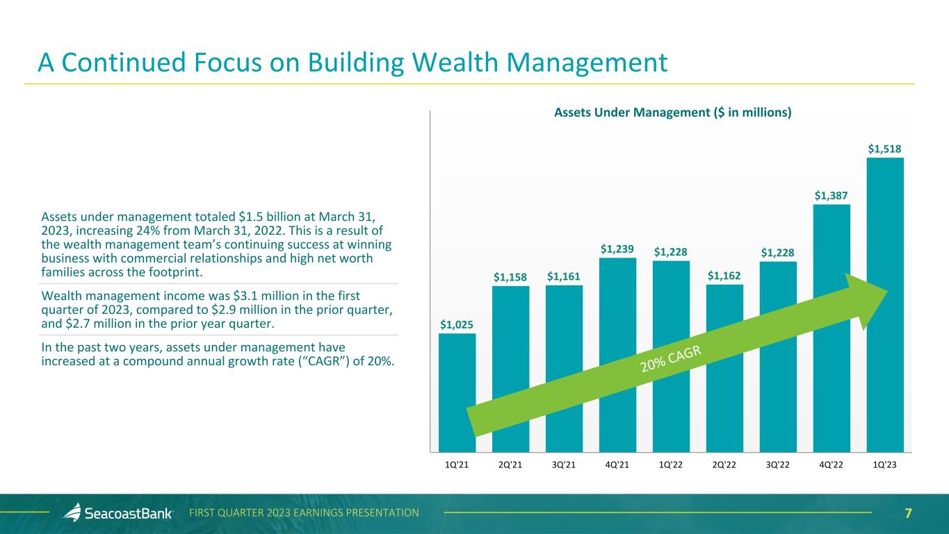 6FIRST QUARTER 2023 EARNINGS PRESENTATION $15,825 $17,633 $20,221 $2,801 $3,996 $4,242 $4,128 $4,650 $4,694 $2,659 $2,886 $3,063$1,686 $426 $426$3,217 $3,344 $4,779$1,334 $1,526 $1,916 BOLI Other Income Insurance Agency Income Mortgage Banking Wealth Management Interchange Income Service Charges 1Q'22 4Q'22 1Q'23 $15,373 $17,651 $22,445 $2,801 $3,996 $4,242 $4,128 $4,650 $4,694 $2,659 $2,886 $3,063$1,686 $426 $426$2,765 $3,362 $7,003 $1,334 $1,526 $1,916 BOLI Other Income Insurance Agency Income Mortgage Banking Wealth Management Interchange Income Service Charges 1Q'22 4Q'22 1Q'23 Adjusted Noninterest Income1 ($ in thousands) 2 3 Noninterest Income ($ in thousands) 1 Non-GAAP measure, see “Explanation of Certain Unaudited Non-GAAP Financial Measures" for more information and a reconciliation to GAAP. 2 Other Income includes income and gains on SBIC investments, SBA gains, marine finance fees, and other fees related to customer activity as well as $2.1 million BOLI benefits on death in 1Q’23, and securities losses of $452 thousand in 1Q’22, gains of $18 thousand in 4Q'22 and gains of $107 thousand in 1Q'23. 3 Other Income on an adjusted basis includes income and gains on SBIC investments, SBA gains, marine finance fees, and other fees related to customer activity. Noninterest Income Noninterest income increased $4.8 million from the prior quarter to $22.4 million, and adjusted noninterest income1 increased $2.6 million to $20.2 million. Changes on an adjusted basis include: • Service charges on deposits increased $0.2 million compared to the prior quarter and increased $1.4 million compared to the prior year quarter, reflecting the benefit of an expanded deposit base including from acquisitions. • The wealth management division continues to demonstrate success in building relationships, and during the first quarter of 2023, income increased $0.2 million, or 6%, compared to the prior quarter and $0.4 million, or 15%, compared to the prior year quarter. The group added another $123 million in assets under management in the first quarter of 2023, bringing overall total assets under management to $1.5 billion, up 24% from the prior year. • Insurance agency income increased $0.3 million, or 37% compared to the prior quarter. The Company acquired a commercial insurance agency during the fourth quarter in conjunction with the acquisition of Drummond Bank, adding another source of noninterest income. • Other income increased $1.4 million compared to the prior quarter, including an increase of $0.4 million in SBIC income and an increase of $0.3 million in loan swap related income. $1,101 $805 $805 $1,101