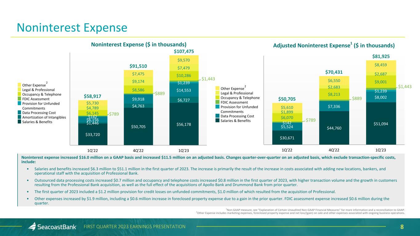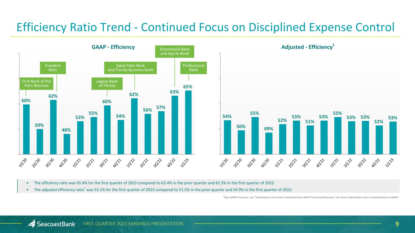 8FIRST QUARTER 2023 EARNINGS PRESENTATION $50,705 $70,431 $81,925 $30,671 $44,760 $51,094 $5,524 $7,336 $8,002 $142 $1,239 $6,070 $8,213 $9,001 $1,899 $2,683 $2,687 $5,610 $6,550 $8,459 Other Expense Legal & Professional Occupancy & Telephone FDIC Assessment Provision for Unfunded Commitments Data Processing Cost Salaries & Benefits 1Q'22 4Q'22 1Q'23 $58,917 $91,510 $107,475 $33,720 $50,705 $56,178$1,446 $4,763 $6,727 $6,156 $9,918 $14,553 $142 $1,239 $6,145 $8,586 $10,286 $4,789 $9,174 $7,479 $5,730 $7,475 $9,570 Other Expense Legal & Professional Occupancy & Telephone FDIC Assessment Provision for Unfunded Commitments Data Processing Cost Amortization of Intangibles Salaries & Benefits 1Q'22 4Q'22 1Q'23 Adjusted Noninterest Expense1 ($ in thousands) 2 2 Noninterest Expense ($ in thousands) Noninterest expense increased $16.0 million on a GAAP basis and increased $11.5 million on an adjusted basis. Changes quarter-over-quarter on an adjusted basis, which exclude transaction-specific costs, include: • Salaries and benefits increased $6.3 million to $51.1 million in the first quarter of 2023. The increase is primarily the result of the increase in costs associated with adding new locations, bankers, and operational staff with the acquisition of Professional Bank. • Outsourced data processing costs increased $0.7 million and occupancy and telephone costs increased $0.8 million in the first quarter of 2023, with higher transaction volume and the growth in customers resulting from the Professional Bank acquisition, as well as the full effect of the acquisitions of Apollo Bank and Drummond Bank from prior quarter. • The first quarter of 2023 included a $1.2 million provision for credit losses on unfunded commitments, $1.0 million of which resulted from the acquisition of Professional. • Other expenses increased by $1.9 million, including a $0.6 million increase in foreclosed property expense due to a gain in the prior quarter. FDIC assessment expense increased $0.6 million during the quarter. 1Non-GAAP measure, see “Explanation of Certain Unaudited Non-GAAP Financial Measures" for more information and a reconciliation to GAAP. 2Other Expense includes marketing expenses, foreclosed property expense and net loss/(gain) on sale and other expenses associated with ongoing business operations. Noninterest Expense $1,443 $889 $789 $789 $889 $1,443