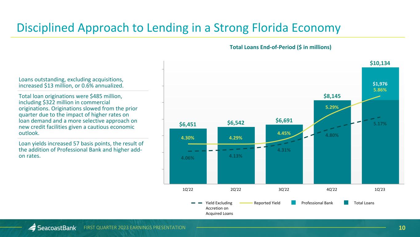 9FIRST QUARTER 2023 EARNINGS PRESENTATION Efficiency Ratio Trend - Continued Focus on Disciplined Expense Control Pa lm B ea ch C om m un ity a nd N or th S ta r Ba nk A cq ui si tio n 60% 50% 62% 48% 53% 55% 60% 54% 62% 56% 57% 63% 65% 1Q '20 2Q '20 3Q '20 4Q '20 1Q '21 2Q '21 3Q '21 4Q '21 1Q '22 2Q '22 3Q '22 4Q '22 1Q '23 54% 50% 55% 49% 52% 53% 51% 53% 55% 53% 53% 52% 53% 1Q '20 2Q '20 3Q '20 4Q '20 1Q '21 2Q '21 3Q '21 4Q '21 1Q '22 2Q '22 3Q '22 4Q '22 1Q '23 GAAP - Efficiency Adjusted - Efficiency1 • The efficiency ratio was 65.4% for the first quarter of 2023 compared to 63.4% in the prior quarter and 62.3% in the first quarter of 2022. • The adjusted efficiency ratio1 was 53.1% for the first quarter of 2023 compared to 51.5% in the prior quarter and 54.9% in the first quarter of 2022. 1Non-GAAP measure, see “Explanation of Certain Unaudited Non-GAAP Financial Measures" for more information and a reconciliation to GAAP. First Bank of the Palm Beaches Freedom Bank Legacy Bank of Florida Sabal Palm Bank and Florida Business Bank Drummond Bank and Apollo Bank Professional Bank