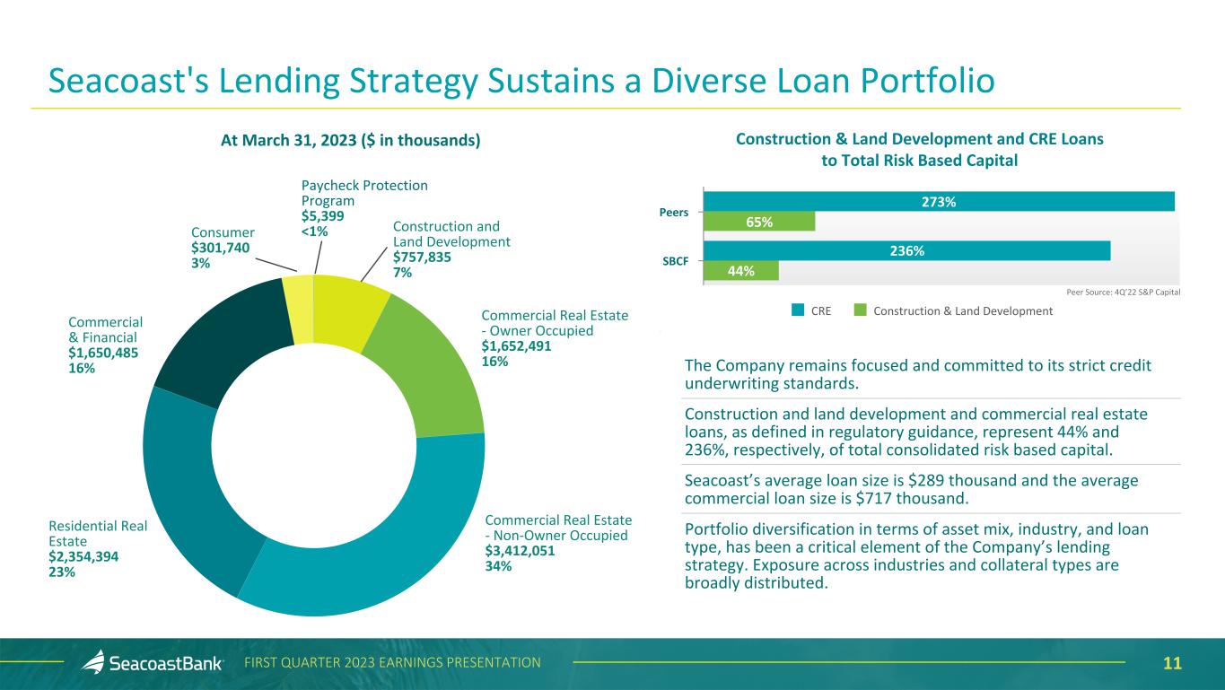 10FIRST QUARTER 2023 EARNINGS PRESENTATION $6,451 $6,542 $6,691 $8,145 $10,134 $1,976 4.30% 4.29% 4.45% 5.29% 5.86% 4.06% 4.13% 4.31% 4.80% 5.17% Yield Excluding Accretion on Acquired Loans Reported Yield Professional Bank Total Loans 1Q'22 2Q'22 3Q'22 4Q'22 1Q'23 Total Loans End-of-Period ($ in millions) Disciplined Approach to Lending in a Strong Florida Economy Loans outstanding, excluding acquisitions, increased $13 million, or 0.6% annualized. Total loan originations were $485 million, including $322 million in commercial originations. Originations slowed from the prior quarter due to the impact of higher rates on loan demand and a more selective approach on new credit facilities given a cautious economic outlook. Loan yields increased 57 basis points, the result of the addition of Professional Bank and higher add- on rates.