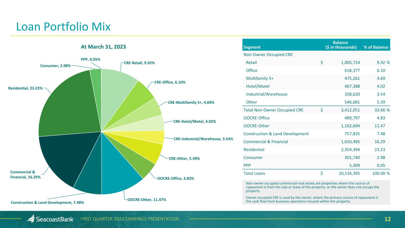 11FIRST QUARTER 2023 EARNINGS PRESENTATION Commercial Real Estate - Owner Occupied $1,652,491 16% Construction and Land Development $757,835 7% Consumer $301,740 3% Commercial & Financial $1,650,485 16% Commercial Real Estate - Non-Owner Occupied $3,412,051 34% Residential Real Estate $2,354,394 23% At March 31, 2023 ($ in thousands) Seacoast's Lending Strategy Sustains a Diverse Loan Portfolio The Company remains focused and committed to its strict credit underwriting standards. Construction and land development and commercial real estate loans, as defined in regulatory guidance, represent 44% and 236%, respectively, of total consolidated risk based capital. Seacoast’s average loan size is $289 thousand and the average commercial loan size is $717 thousand. Portfolio diversification in terms of asset mix, industry, and loan type, has been a critical element of the Company’s lending strategy. Exposure across industries and collateral types are broadly distributed. Construction & Land Development and CRE Loans to Total Risk Based Capital 273% 236% 65% 44% CRE Construction & Land Development Peers SBCF Peer Source: 4Q’22 S&P Capital Paycheck Protection Program $5,399 <1%
