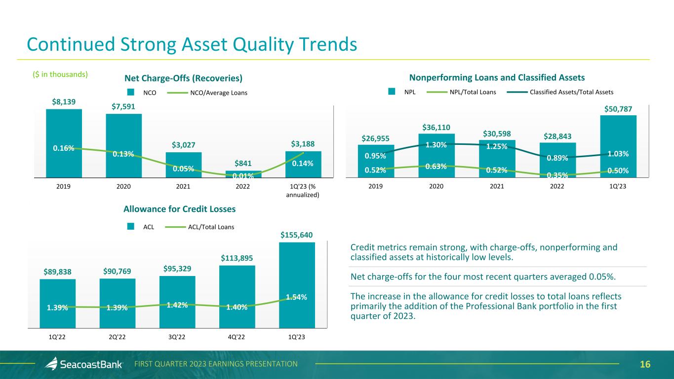 15FIRST QUARTER 2023 EARNINGS PRESENTATION Allowance for Credit Losses and Purchase Discount ($ in thousands) Loans Outstanding Allowance for Credit Losses % of Category Purchase Discount % of Category Construction and Land Development $ 757,835 $ 6,540 0.86 % $ 13,018 1.72 % Owner Occupied Commercial Real Estate 1,652,491 6,292 0.38 31,266 1.89 Commercial Real Estate 3,412,051 53,575 1.57 98,064 2.87 Residential Real Estate 2,354,394 40,599 1.72 35,883 1.52 Commercial & Financial 1,650,485 31,593 1.91 32,600 1.98 Consumer 301,740 17,041 5.65 5,144 1.70 Total Excluding PPP $ 10,128,996 $ 155,640 1.54 % $ 215,975 2.13 % Paycheck Protection Program $ 5,399 $ — — % $ — — % Total $ 10,134,395 $ 155,640 1.54 % $ 215,975 2.13 % The total allowance for credit losses of $155.6 million as of March 31, 2023, represents management’s estimate of lifetime expected credit losses. Combined with the $216.0 million remaining unrecognized discount on acquired loans, a total of $371.6 million, or 3.67%, of total loans is available to cover potential losses. As acquired loans are repaid, the unrecognized discount is earned as an adjustment to yield over the life of the loans. Additionally, a reserve for potential credit losses on lending-related commitments of $4.7 million is reflected within Other Liabilities.