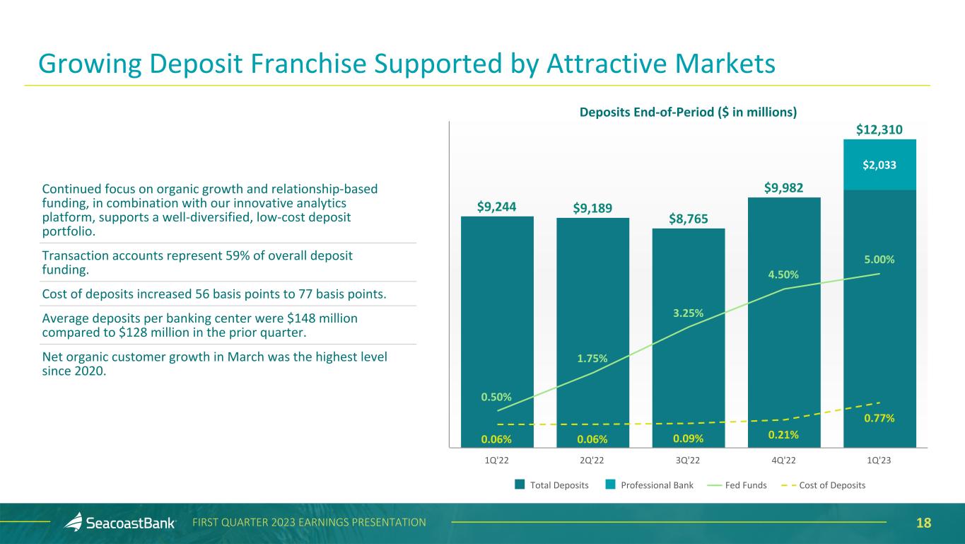 17FIRST QUARTER 2023 EARNINGS PRESENTATION Investment Securities Performance and Composition Unrealized Loss in Securities as of March 31, 2023 (in thousands) Amortized Cost Fair Value Net Unrealized Gain /(Loss) Δ from 4Q’22 Available for Sale Government backed $ 43,448 $ 43,384 $ (64) $ 102 Agency mortgage backed 1,657,149 1,454,488 (202,661) 19,883 Private label MBS and CMOs 175,629 163,374 (12,255) 506 CLO 312,086 305,477 (6,609) 3,642 Municipal 22,016 20,671 (1,345) 264 Other debt securities 28,799 28,573 (226) 4 Total Available for Sale $ 2,239,127 $ 2,015,967 $ (223,160) $ 24,401 Held to Maturity Agency mortgage backed $ 737,911 $ 618,776 $ (119,135) $ 10,532 Total Held to Maturity $ 737,911 $ 618,776 $ (119,135) $ 10,532 Total Securities $ 2,977,038 $ 2,634,743 $ (342,295) $ 34,933 ($ in m ill io ns ) $747 $795 $775 $747 $738 $1,707 $1,801 $1,861 $1,872 $2,016 1.68% 1.98% 2.36% 2.77% 2.85% HTM Securities AFS Securities Yield 1Q'22 2Q'22 3Q'22 4Q'22 1Q'23 • Portfolio yield increased eight basis points to 2.85% from 2.77% in the prior quarter. • AFS securities ended the quarter with a net unrealized loss of $223.2 million compared to a net unrealized loss of $247.6 million at December 31, 2022. • HTM securities ended the quarter with a net unrealized loss of $119.1 million compared to a net unrealized loss of $129.7 million at December 31, 2022. • High quality portfolio consisting of 80% agency backed, with the remainder comprised primarily of highly-rated investment grade bonds. CLO portfolio is 61% AAA and 39% AA. • AFS portfolio duration of 3.84, total portfolio duration of 4.42.