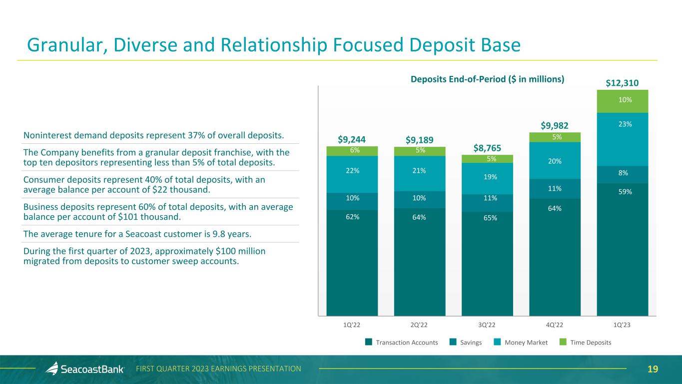 18FIRST QUARTER 2023 EARNINGS PRESENTATION Deposits End-of-Period ($ in millions) $9,244 $9,189 $8,765 $9,982 $12,310 $2,033 0.50% 1.75% 3.25% 4.50% 5.00% 0.06% 0.06% 0.09% 0.21% 0.77% Total Deposits Professional Bank Fed Funds Cost of Deposits 1Q'22 2Q'22 3Q'22 4Q'22 1Q'23 Growing Deposit Franchise Supported by Attractive Markets Continued focus on organic growth and relationship-based funding, in combination with our innovative analytics platform, supports a well-diversified, low-cost deposit portfolio. Transaction accounts represent 59% of overall deposit funding. Cost of deposits increased 56 basis points to 77 basis points. Average deposits per banking center were $148 million compared to $128 million in the prior quarter. Net organic customer growth in March was the highest level since 2020.