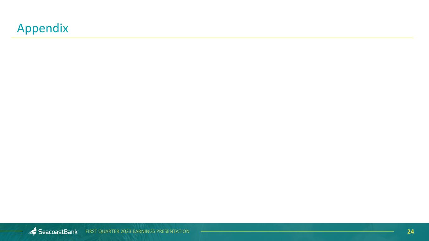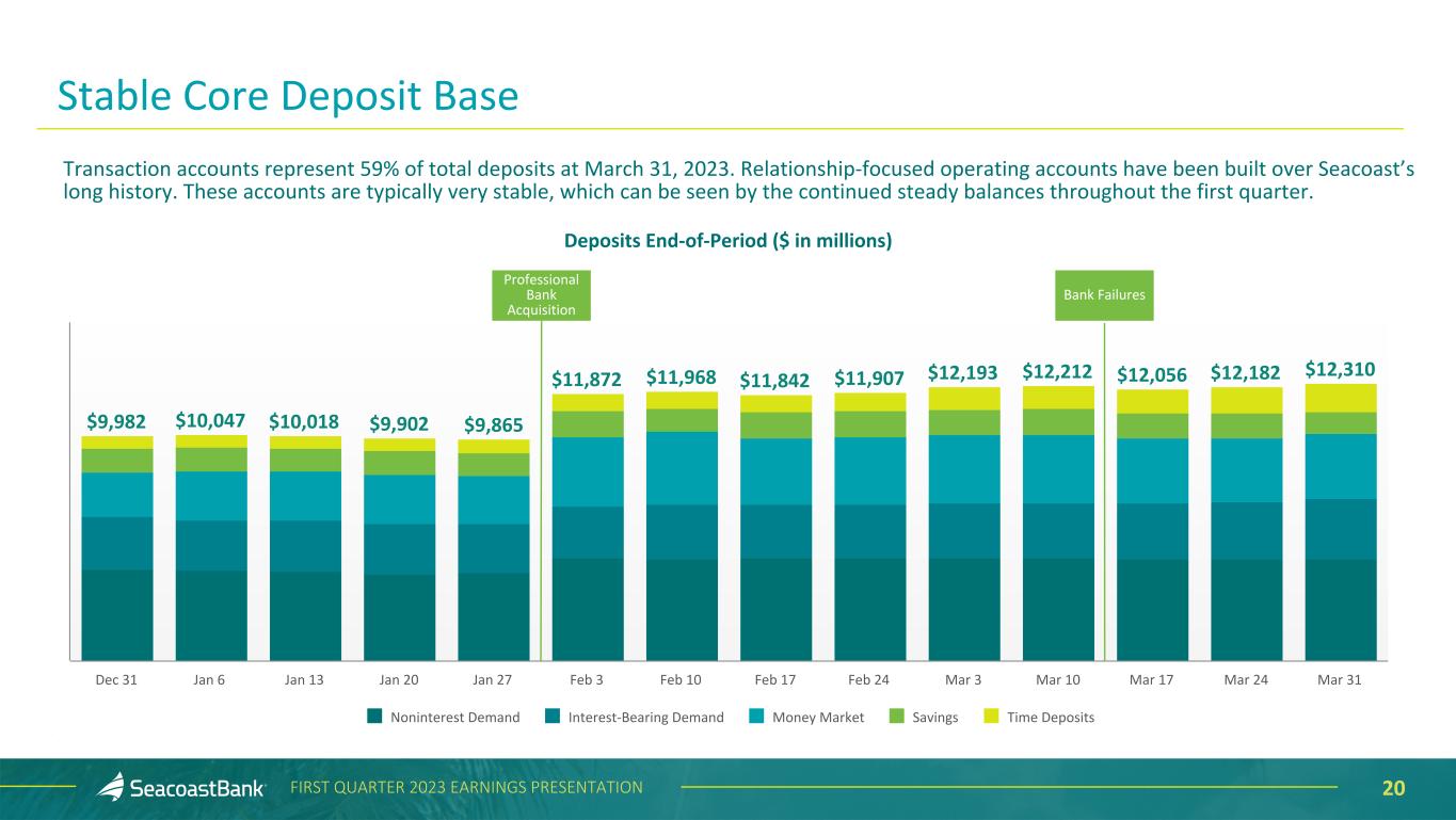 19FIRST QUARTER 2023 EARNINGS PRESENTATION Deposits End-of-Period ($ in millions) $9,244 $9,189 $8,765 $9,982 $12,310 Transaction Accounts Savings Money Market Time Deposits 1Q'22 2Q'22 3Q'22 4Q'22 1Q'23 Granular, Diverse and Relationship Focused Deposit Base Noninterest demand deposits represent 37% of overall deposits. The Company benefits from a granular deposit franchise, with the top ten depositors representing less than 5% of total deposits. Consumer deposits represent 40% of total deposits, with an average balance per account of $22 thousand. Business deposits represent 60% of total deposits, with an average balance per account of $101 thousand. The average tenure for a Seacoast customer is 9.8 years. During the first quarter of 2023, approximately $100 million migrated from deposits to customer sweep accounts. 62% 10% 22% 6% 64% 10% 21% 5% 65% 11% 19% 5% 64% 11% 20% 5% 10% 23% 8% 59%