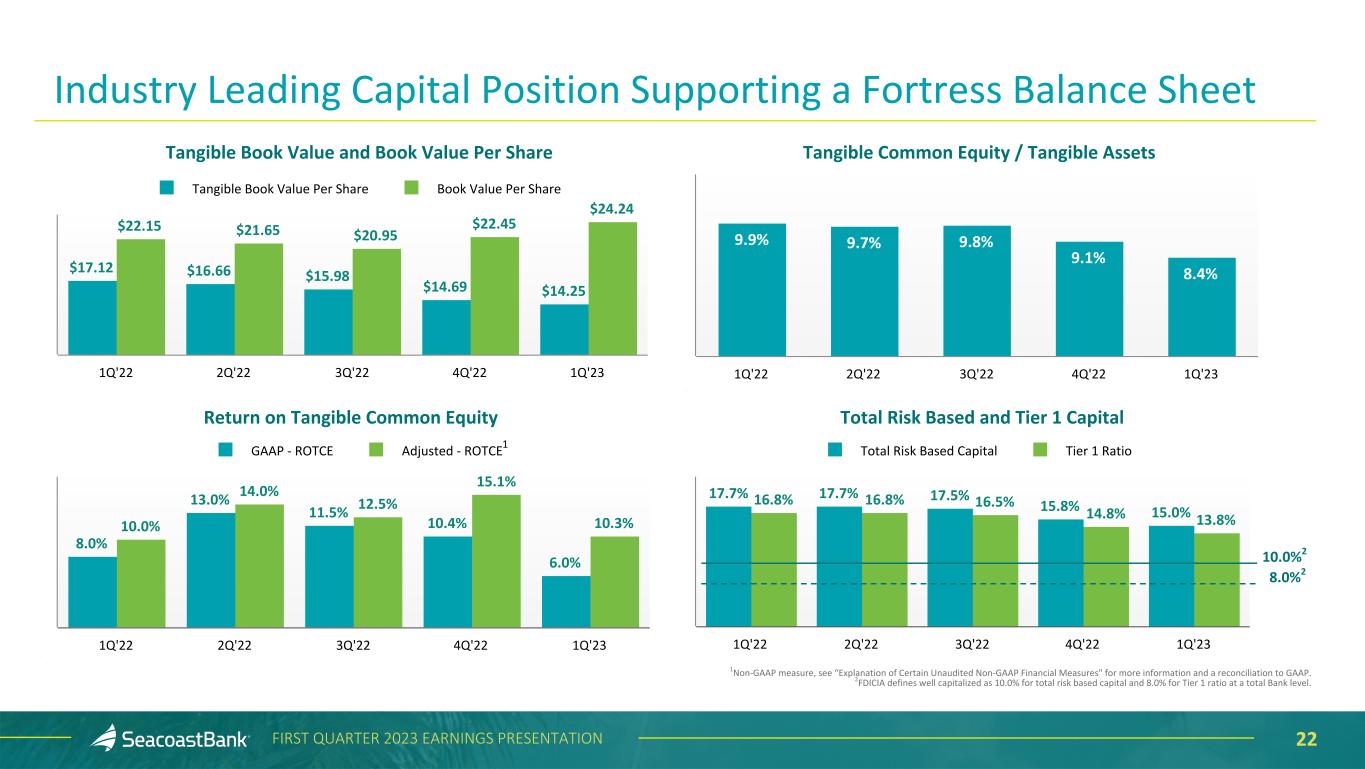 21FIRST QUARTER 2023 EARNINGS PRESENTATION Liquidity Sources vs Uninsured Deposits Cash and Borrowing Capacity vs. Uninsured Deposits ($ in millions) $6,356 $3,888 $791 $2,661 $431 $1,496 $300 $677 Borrowing Capacity + Cash Uninsured and Uncollateralized Deposits Total Cash & Borrowing Capacity = $6.4 Billion Uninsured and Uncollateralized Deposits = $3.9 Billion Uninsured and uncollateralized deposits represent 32% of total deposits. Total liquidity sources of $6.4 billion compared to uninsured and uncollateralized deposits of $3.9 billion, representing a 163% coverage ratio. Without using FHLB borrowing capacity, lines of credit, or liquidating unpledged securities, SBCF could fund the loss of all uninsured and uncollateralized deposits with cash and borrowing capacity at the Federal Reserve. Uninsured deposits represent 36% of overall deposit accounts. This includes public funds, which are protected from loss beyond FDIC insurance limits. Unpledged Securities Lines of Credit Discount Window Cash BTFP FHLB