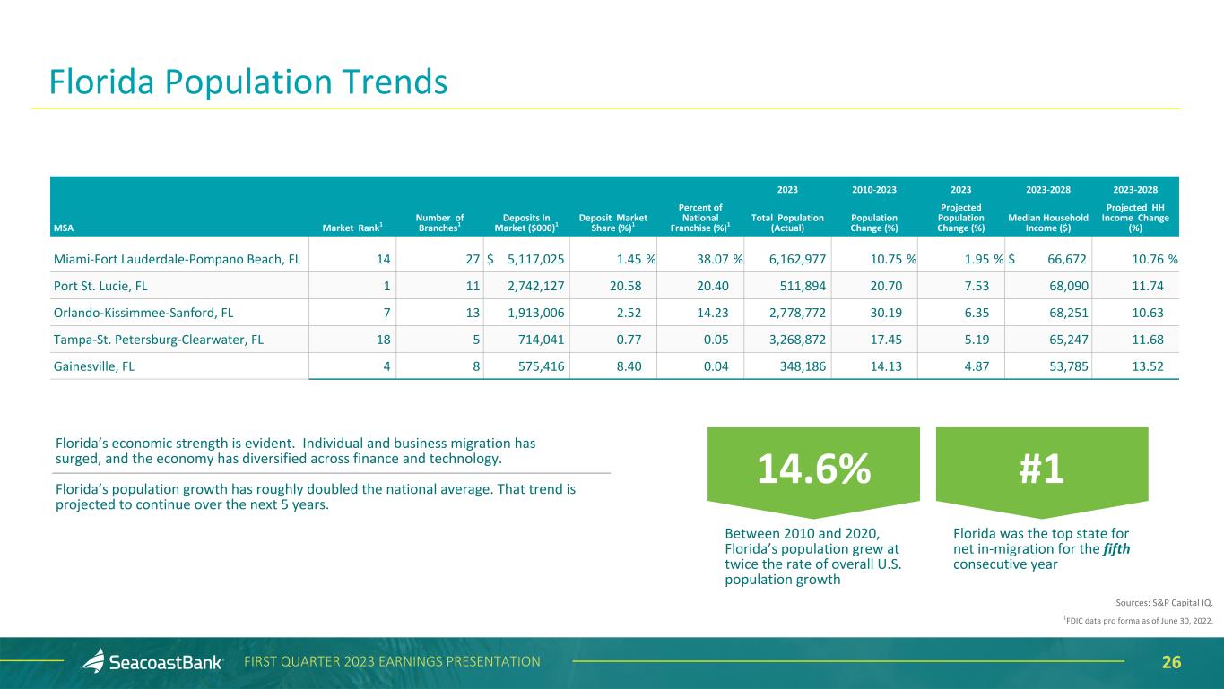 26FIRST QUARTER 2023 EARNINGS PRESENTATION Florida Population Trends Florida’s economic strength is evident. Individual and business migration has surged, and the economy has diversified across finance and technology. Florida’s population growth has roughly doubled the national average. That trend is projected to continue over the next 5 years. Between 2010 and 2020, Florida’s population grew at twice the rate of overall U.S. population growth 14.6% Florida was the top state for net in-migration for the fifth consecutive year #1 2023 2010-2023 2023 2023-2028 2023-2028 MSA Market Rank1 Number of Branches1 Deposits In Market ($000)1 Deposit Market Share (%)1 Percent of National Franchise (%)1 Total Population (Actual) Population Change (%) Projected Population Change (%) Median Household Income ($) Projected HH Income Change (%) Miami-Fort Lauderdale-Pompano Beach, FL 14 27 $ 5,117,025 1.45 % 38.07 % 6,162,977 10.75 % 1.95 % $ 66,672 10.76 % Port St. Lucie, FL 1 11 2,742,127 20.58 20.40 511,894 20.70 7.53 68,090 11.74 Orlando-Kissimmee-Sanford, FL 7 13 1,913,006 2.52 14.23 2,778,772 30.19 6.35 68,251 10.63 Tampa-St. Petersburg-Clearwater, FL 18 5 714,041 0.77 0.05 3,268,872 17.45 5.19 65,247 11.68 Gainesville, FL 4 8 575,416 8.40 0.04 348,186 14.13 4.87 53,785 13.52 Sources: S&P Capital IQ. 1FDIC data pro forma as of June 30, 2022.