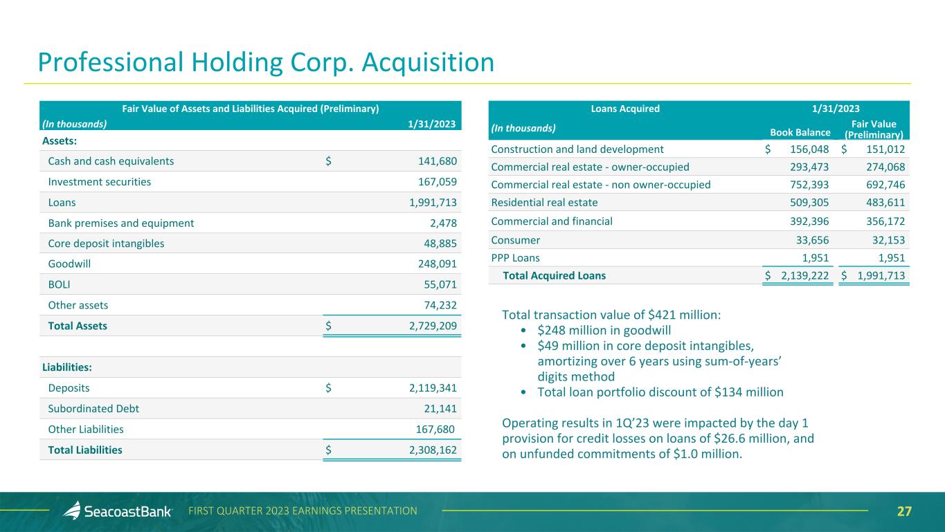 27FIRST QUARTER 2023 EARNINGS PRESENTATION Fair Value of Assets and Liabilities Acquired (Preliminary) (In thousands) 1/31/2023 Assets: Cash and cash equivalents $ 141,680 Investment securities 167,059 Loans 1,991,713 Bank premises and equipment 2,478 Core deposit intangibles 48,885 Goodwill 248,091 BOLI 55,071 Other assets 74,232 Total Assets $ 2,729,209 Liabilities: Deposits $ 2,119,341 Subordinated Debt 21,141 Other Liabilities 167,680 Total Liabilities $ 2,308,162 Professional Holding Corp. Acquisition Total transaction value of $421 million: • $248 million in goodwill • $49 million in core deposit intangibles, amortizing over 6 years using sum-of-years’ digits method • Total loan portfolio discount of $134 million Operating results in 1Q’23 were impacted by the day 1 provision for credit losses on loans of $26.6 million, and on unfunded commitments of $1.0 million. Loans Acquired 1/31/2023 (In thousands) Book Balance Fair Value (Preliminary) Construction and land development $ 156,048 $ 151,012 Commercial real estate - owner-occupied 293,473 274,068 Commercial real estate - non owner-occupied 752,393 692,746 Residential real estate 509,305 483,611 Commercial and financial 392,396 356,172 Consumer 33,656 32,153 PPP Loans 1,951 1,951 Total Acquired Loans $ 2,139,222 $ 1,991,713