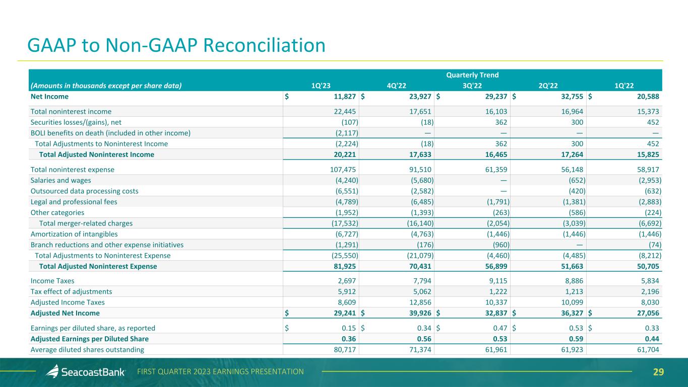 28FIRST QUARTER 2023 EARNINGS PRESENTATION This presentation contains financial information determined by methods other than Generally Accepted Accounting Principles (“GAAP”). The financial highlights provide reconciliations between GAAP and adjusted financial measures including net income, noninterest income, noninterest expense, tax adjustments and other financial ratios. Management uses these non-GAAP financial measures in its analysis of the Company’s performance and believes these presentations provide useful supplemental information, and a clearer understanding of the Company’s performance. The Company believes the non-GAAP measures enhance investors’ understanding of the Company’s business and performance and if not provided would be requested by the investor community. These measures are also useful in understanding performance trends and facilitate comparisons with the performance of other financial institutions. The limitations associated with operating measures are the risk that persons might disagree as to the appropriateness of items comprising these measures and that different companies might define or calculate these measures differently. The Company provides reconciliations between GAAP and these non-GAAP measures. These disclosures should not be considered an alternative to GAAP. Explanation of Certain Unaudited Non-GAAP Financial Measures