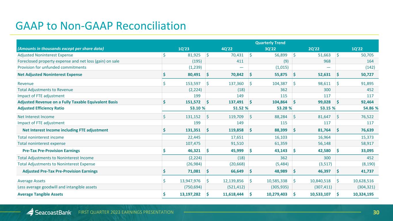 29FIRST QUARTER 2023 EARNINGS PRESENTATION Quarterly Trend (Amounts in thousands except per share data) 1Q'23 4Q'22 3Q'22 2Q'22 1Q'22 Net Income $ 11,827 $ 23,927 $ 29,237 $ 32,755 $ 20,588 Total noninterest income 22,445 17,651 16,103 16,964 15,373 Securities losses/(gains), net (107) (18) 362 300 452 BOLI benefits on death (included in other income) (2,117) — — — — Total Adjustments to Noninterest Income (2,224) (18) 362 300 452 Total Adjusted Noninterest Income 20,221 17,633 16,465 17,264 15,825 Total noninterest expense 107,475 91,510 61,359 56,148 58,917 Salaries and wages (4,240) (5,680) — (652) (2,953) Outsourced data processing costs (6,551) (2,582) — (420) (632) Legal and professional fees (4,789) (6,485) (1,791) (1,381) (2,883) Other categories (1,952) (1,393) (263) (586) (224) Total merger-related charges (17,532) (16,140) (2,054) (3,039) (6,692) Amortization of intangibles (6,727) (4,763) (1,446) (1,446) (1,446) Branch reductions and other expense initiatives (1,291) (176) (960) — (74) Total Adjustments to Noninterest Expense (25,550) (21,079) (4,460) (4,485) (8,212) Total Adjusted Noninterest Expense 81,925 70,431 56,899 51,663 50,705 Income Taxes 2,697 7,794 9,115 8,886 5,834 Tax effect of adjustments 5,912 5,062 1,222 1,213 2,196 Adjusted Income Taxes 8,609 12,856 10,337 10,099 8,030 Adjusted Net Income $ 29,241 $ 39,926 $ 32,837 $ 36,327 $ 27,056 Earnings per diluted share, as reported $ 0.15 $ 0.34 $ 0.47 $ 0.53 $ 0.33 Adjusted Earnings per Diluted Share 0.36 0.56 0.53 0.59 0.44 Average diluted shares outstanding 80,717 71,374 61,961 61,923 61,704 GAAP to Non-GAAP Reconciliation