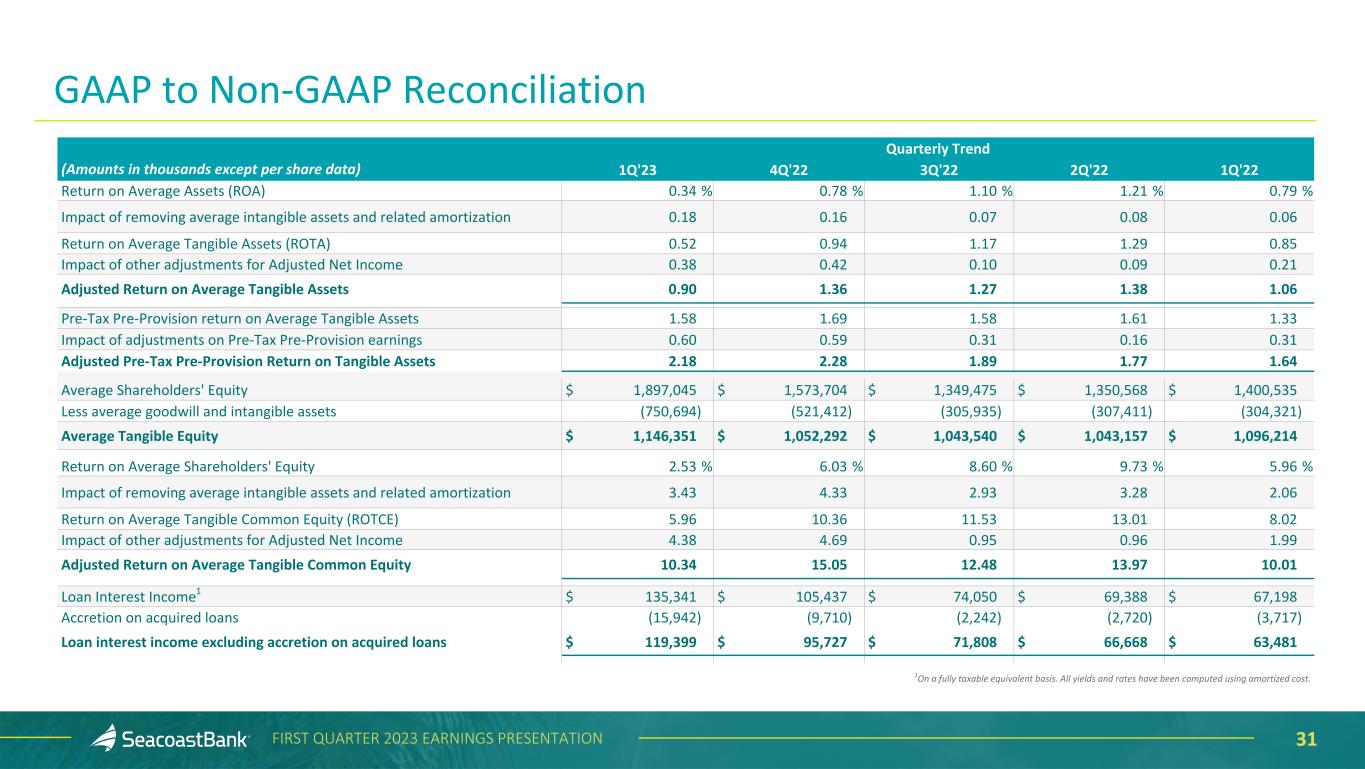 30FIRST QUARTER 2023 EARNINGS PRESENTATION Quarterly Trend (Amounts in thousands except per share data) 1Q'23 4Q'22 3Q'22 2Q'22 1Q'22 Adjusted Noninterest Expense $ 81,925 $ 70,431 $ 56,899 $ 51,663 $ 50,705 Foreclosed property expense and net loss (gain) on sale (195) 411 (9) 968 164 Provision for unfunded commitments (1,239) — (1,015) — (142) Net Adjusted Noninterest Expense $ 80,491 $ 70,842 $ 55,875 $ 52,631 $ 50,727 Revenue $ 153,597 $ 137,360 $ 104,387 $ 98,611 $ 91,895 Total Adjustments to Revenue (2,224) (18) 362 300 452 Impact of FTE adjustment 199 149 115 117 117 Adjusted Revenue on a Fully Taxable Equivalent Basis $ 151,572 $ 137,491 $ 104,864 $ 99,028 $ 92,464 Adjusted Efficiency Ratio 53.10 % 51.52 % 53.28 % 53.15 % 54.86 % Net Interest Income $ 131,152 $ 119,709 $ 88,284 $ 81,647 $ 76,522 Impact of FTE adjustment 199 149 115 117 117 Net Interest Income including FTE adjustment $ 131,351 $ 119,858 $ 88,399 $ 81,764 $ 76,639 Total noninterest income 22,445 17,651 16,103 16,964 15,373 Total noninterest expense 107,475 91,510 61,359 56,148 58,917 Pre-Tax Pre-Provision Earnings $ 46,321 $ 45,999 $ 43,143 $ 42,580 $ 33,095 Total Adjustments to Noninterest Income (2,224) (18) 362 300 452 Total Adjustments to Noninterest Expense (26,984) (20,668) (5,484) (3,517) (8,190) Adjusted Pre-Tax Pre-Provision Earnings $ 71,081 $ 66,649 $ 48,989 $ 46,397 $ 41,737 Average Assets $ 13,947,976 $ 12,139,856 $ 10,585,338 $ 10,840,518 $ 10,628,516 Less average goodwill and intangible assets (750,694) (521,412) (305,935) (307,411) (304,321) Average Tangible Assets $ 13,197,282 $ 11,618,444 $ 10,279,403 $ 10,533,107 $ 10,324,195 GAAP to Non-GAAP Reconciliation