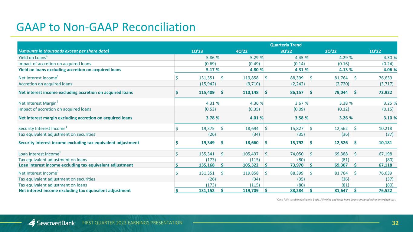 31FIRST QUARTER 2023 EARNINGS PRESENTATION Quarterly Trend (Amounts in thousands except per share data) 1Q'23 4Q'22 3Q'22 2Q'22 1Q'22 Return on Average Assets (ROA) 0.34 % 0.78 % 1.10 % 1.21 % 0.79 % Impact of removing average intangible assets and related amortization 0.18 0.16 0.07 0.08 0.06 Return on Average Tangible Assets (ROTA) 0.52 0.94 1.17 1.29 0.85 Impact of other adjustments for Adjusted Net Income 0.38 0.42 0.10 0.09 0.21 Adjusted Return on Average Tangible Assets 0.90 1.36 1.27 1.38 1.06 Pre-Tax Pre-Provision return on Average Tangible Assets 1.58 1.69 1.58 1.61 1.33 Impact of adjustments on Pre-Tax Pre-Provision earnings 0.60 0.59 0.31 0.16 0.31 Adjusted Pre-Tax Pre-Provision Return on Tangible Assets 2.18 2.28 1.89 1.77 1.64 Average Shareholders' Equity $ 1,897,045 $ 1,573,704 $ 1,349,475 $ 1,350,568 $ 1,400,535 Less average goodwill and intangible assets (750,694) (521,412) (305,935) (307,411) (304,321) Average Tangible Equity $ 1,146,351 $ 1,052,292 $ 1,043,540 $ 1,043,157 $ 1,096,214 Return on Average Shareholders' Equity 2.53 % 6.03 % 8.60 % 9.73 % 5.96 % Impact of removing average intangible assets and related amortization 3.43 4.33 2.93 3.28 2.06 Return on Average Tangible Common Equity (ROTCE) 5.96 10.36 11.53 13.01 8.02 Impact of other adjustments for Adjusted Net Income 4.38 4.69 0.95 0.96 1.99 Adjusted Return on Average Tangible Common Equity 10.34 15.05 12.48 13.97 10.01 Loan Interest Income1 $ 135,341 $ 105,437 $ 74,050 $ 69,388 $ 67,198 Accretion on acquired loans (15,942) (9,710) (2,242) (2,720) (3,717) Loan interest income excluding accretion on acquired loans $ 119,399 $ 95,727 $ 71,808 $ 66,668 $ 63,481 1On a fully taxable equivalent basis. All yields and rates have been computed using amortized cost. GAAP to Non-GAAP Reconciliation