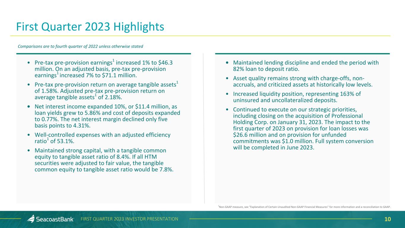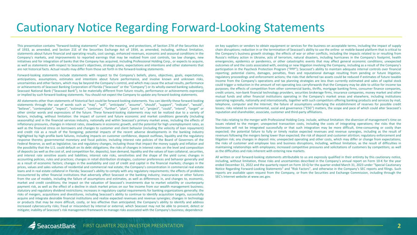 2FIRST QUARTER 2023 INVESTOR PRESENTATION This presentation contains “forward-looking statements” within the meaning, and protections, of Section 27A of the Securities Act of 1933, as amended, and Section 21E of the Securities Exchange Act of 1934, as amended, including, without limitation, statements about future financial and operating results, cost savings, enhanced revenues, economic and seasonal conditions in the Company’s markets, and improvements to reported earnings that may be realized from cost controls, tax law changes, new initiatives and for integration of banks that the Company has acquired, including Professional Holding Corp., or expects to acquire, as well as statements with respect to Seacoast's objectives, strategic plans, expectations and intentions and other statements that are not historical facts. Actual results may differ from those set forth in the forward-looking statements. Forward-looking statements include statements with respect to the Company’s beliefs, plans, objectives, goals, expectations, anticipations, assumptions, estimates and intentions about future performance, and involve known and unknown risks, uncertainties and other factors, which may be beyond the Company’s control, and which may cause the actual results, performance or achievements of Seacoast Banking Corporation of Florida (“Seacoast” or the “Company”) or its wholly-owned banking subsidiary, Seacoast National Bank (“Seacoast Bank”), to be materially different from future results, performance or achievements expressed or implied by such forward-looking statements. You should not expect the Company to update any forward-looking statements. All statements other than statements of historical fact could be forward-looking statements. You can identify these forward-looking statements through the use of words such as "may", "will", "anticipate", "assume", "should", "support", "indicate", "would", "believe", "contemplate", "expect", "estimate", "continue", "further", "plan", "point to", "project", "could", "intend", "target" or other similar words and expressions of the future. These forward-looking statements may not be realized due to a variety of factors, including, without limitation: the impact of current and future economic and market conditions generally (including seasonality) and in the financial services industry, nationally and within Seacoast’s primary market areas, including the effects of inflationary pressures, changes in interest rates, slowdowns in economic growth, and the potential for high unemployment rates, as well as the financial stress on borrowers and changes to customer and client behavior (including the velocity of loan repayment) and credit risk as a result of the foregoing; potential impacts of the recent adverse developments in the banking industry highlighted by high-profile bank failures, including impacts on customer confidence, deposit outflows, liquidity and the regulatory response thereto; governmental monetary and fiscal policies, including interest rate policies of the Board of Governors of the Federal Reserve, as well as legislative, tax and regulatory changes, including those that impact the money supply and inflation and the possibility that the U.S. could default on its debt obligations; the risks of changes in interest rates on the level and composition of deposits (as well as the cost of, and competition for, deposits), loan demand, liquidity and the values of loan collateral, securities, and interest rate sensitive assets and liabilities; interest rate risks, sensitivities and the shape of the yield curve; changes in accounting policies, rules and practices; changes in retail distribution strategies, customer preferences and behavior generally and as a result of economic factors; changes in the availability and cost of credit and capital in the financial markets; changes in the prices, values and sales volumes of residential and commercial real estate; the Company’s concentration in commercial real estate loans and in real estate collateral in Florida; Seacoast’s ability to comply with any regulatory requirements; the effects of problems encountered by other financial institutions that adversely affect Seacoast or the banking industry; inaccuracies or other failures from the use of models, including the failure of assumptions and estimates, as well as differences in, and changes to, economic, market and credit conditions; the impact on the valuation of Seacoast’s investments due to market volatility or counterparty payment risk, as well as the effect of a decline in stock market prices on our fee income from our wealth management business; statutory and regulatory dividend restrictions; increases in regulatory capital requirements for banking organizations generally; the risks of mergers, acquisitions and divestitures, including Seacoast’s ability to continue to identify acquisition targets, successfully acquire and integrate desirable financial institutions and realize expected revenues and revenue synergies; changes in technology or products that may be more difficult, costly, or less effective than anticipated; the Company’s ability to identify and address increased cybersecurity risks; fraud or misconduct by internal or external, which Seacoast may not be able to prevent, detect or mitigate; inability of Seacoast’s risk management framework to manage risks associated with the Company’s business; dependence on key suppliers or vendors to obtain equipment or services for the business on acceptable terms, including the impact of supply chain disruptions; reduction in or the termination of Seacoast’s ability to use the online- or mobile-based platform that is critical to the Company’s business growth strategy; the effects of war or other conflicts, including the impacts related to or resulting from Russia’s military action in Ukraine, acts of terrorism, natural disasters, including hurricanes in the Company’s