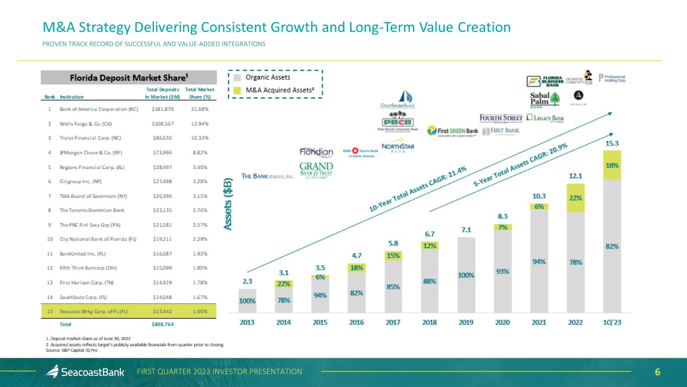 5FIRST QUARTER 2023 INVESTOR PRESENTATION • $15.3 billion in assets as of March 31, 2023, operating in the nation’s fastest growing and third most populated state • Strong presence in Florida’s most attractive markets ▪ #1 Florida-based bank in Orlando MSA ▪ #1 Florida-based bank in Palm Beach county ▪ #1 market share in Port St. Lucie MSA ▪ #2 Florida-based bank in St. Petersburg • A top three publicly traded community bank headquartered in Florida • Market Cap: $2.0 billion as of March 31, 2023 • Serving over 270,000 customers throughout Florida, with a wide variety of customer segments and industries • Strong capital position, supporting further organic growth and opportunistic acquisitions • Unique customer analytics capabilities, driving value creation with new, acquired, and existing customers Jacksonville MSA West Palm Beach Fort Lauderdale Miami MSA Port St. Lucie MSA Orlando MSA Tampa St. Petersburg MSA Naples Fort Myers MSA Valuable Florida Franchise, Well-Positioned with Strong Capital SEACOAST BANK FOOTPRINT