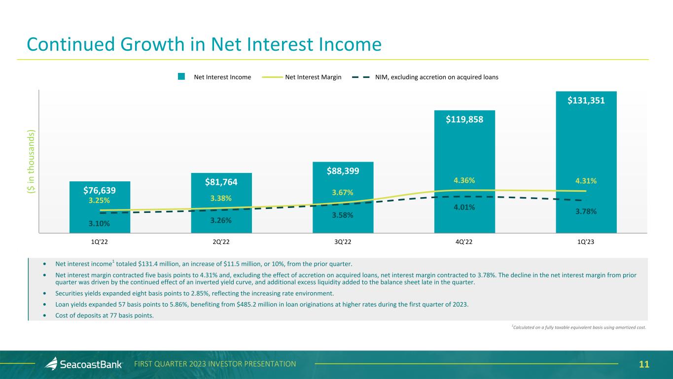 10FIRST QUARTER 2023 INVESTOR PRESENTATION • Pre-tax pre-provision earnings1 increased 1% to $46.3 million. On an adjusted basis, pre-tax pre-provision earnings1 increased 7% to $71.1 million. • Pre-tax pre-provision return on average tangible assets1 of 1.58%. Adjusted pre-tax pre-provision return on average tangible assets1 of 2.18%. • Net interest income expanded 10%, or $11.4 million, as loan yields grew to 5.86% and cost of deposits expanded to 0.77%. The net interest margin declined only five basis points to 4.31%. • Well-controlled expenses with an adjusted efficiency ratio1 of 53.1%. • Maintained strong capital, with a tangible common equity to tangible asset ratio of 8.4%. If all HTM securities were adjusted to fair value, the tangible common equity to tangible asset ratio would be 7.8%. • Maintained lending discipline and ended the period with 82% loan to deposit ratio. • Asset quality remains strong with charge-offs, non- accruals, and criticized assets at historically low levels. • Increased liquidity position, representing 163% of uninsured and uncollateralized deposits. • Continued to execute on our strategic priorities, including closing on the acquisition of Professional Holding Corp. on January 31, 2023. The impact to the first quarter of 2023 on provision for loan losses was $26.6 million and on provision for unfunded commitments was $1.0 million. Full system conversion will be completed in June 2023. First Quarter 2023 Highlights 1Non-GAAP measure, see “Explanation of Certain Unaudited Non-GAAP Financial Measures" for more information and a reconciliation to GAAP. Comparisons are to fourth quarter of 2022 unless otherwise stated