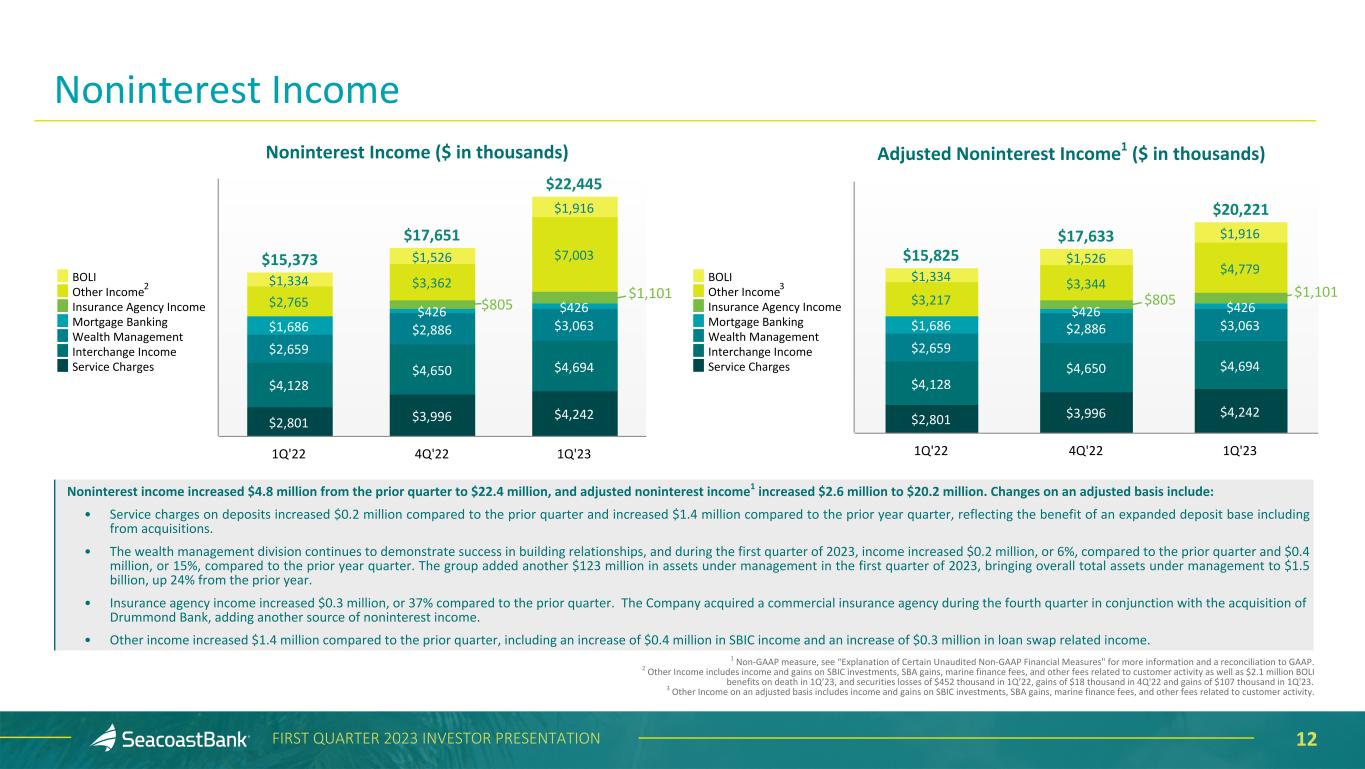 11FIRST QUARTER 2023 INVESTOR PRESENTATION Continued Growth in Net Interest Income ($ in th ou sa nd s) $76,639 $81,764 $88,399 $119,858 $131,351 3.25% 3.38% 3.67% 4.36% 4.31% 3.10% 3.26% 3.58% 4.01% 3.78% Net Interest Income Net Interest Margin NIM, excluding accretion on acquired loans 1Q'22 2Q'22 3Q'22 4Q'22 1Q'23 • Net interest income1 totaled $131.4 million, an increase of $11.5 million, or 10%, from the prior quarter. • Net interest margin contracted five basis points to 4.31% and, excluding the effect of accretion on acquired loans, net interest margin contracted to 3.78%. The decline in the net interest margin from prior quarter was driven by the continued effect of an inverted yield curve, and additional excess liquidity added to the balance sheet late in the quarter. • Securities yields expanded eight basis points to 2.85%, reflecting the increasing rate environment. • Loan yields expanded 57 basis points to 5.86%, benefiting from $485.2 million in loan originations at higher rates during the first quarter of 2023. • Cost of deposits at 77 basis points. 1Calculated on a fully taxable equivalent basis using amortized cost.