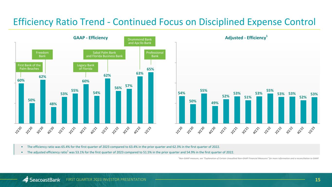 14FIRST QUARTER 2023 INVESTOR PRESENTATION $50,705 $70,431 $81,925 $30,671 $44,760 $51,094 $5,524 $7,336 $8,002 $142 $1,239 $6,070 $8,213 $9,001 $1,899 $2,683 $2,687 $5,610 $6,550 $8,459 Other Expense Legal & Professional Occupancy & Telephone FDIC Assessment Provision for Unfunded Commitments Data Processing Cost Salaries & Benefits 1Q'22 4Q'22 1Q'23 $58,917 $91,510 $107,475 $33,720 $50,705 $56,178$1,446 $4,763 $6,727 $6,156 $9,918 $14,553 $142 $1,239 $6,145 $8,586 $10,286 $4,789 $9,174 $7,479 $5,730 $7,475 $9,570 Other Expense Legal & Professional Occupancy & Telephone FDIC Assessment Provision for Unfunded Commitments Data Processing Cost Amortization of Intangibles Salaries & Benefits 1Q'22 4Q'22 1Q'23 Adjusted Noninterest Expense1 ($ in thousands) 2 2 Noninterest Expense ($ in thousands) Noninterest expense increased $16.0 million on a GAAP basis and increased $11.5 million on an adjusted basis. Changes quarter-over-quarter on an adjusted basis, which exclude transaction-specific costs, include: • Salaries and benefits increased $6.3 million to $51.1 million in the first quarter of 2023. The increase is primarily the result of the increase in costs associated with adding new locations, bankers, and operational staff with the acquisition of Professional Bank. • Outsourced data processing costs increased $0.7 million and occupancy and telephone costs increased $0.8 million in the first quarter of 2023, with higher transaction volume and the growth in customers resulting from the Professional Bank acquisition, as well as the full effect of the acquisitions of Apollo Bank and Drummond Bank from prior quarter. • The first quarter of 2023 included a $1.2 million provision for credit losses on unfunded commitments, $1.0 million of which resulted from the acquisition of Professional. • Other expenses increased by $1.9 million, including a $0.6 million increase in foreclosed property expense due to a gain in the prior quarter. FDIC assessment expense increased $0.6 million during the quarter. 1Non-GAAP measure, see “Explanation of Certain Unaudited Non-GAAP Financial Measures" for more information and a reconciliation to GAAP. 2Other Expense includes marketing expenses, foreclosed property expense and net loss/(gain) on sale and other expenses associated with ongoing business operations. Noninterest Expense $1,443 $889 $789 $789 $889 $1,443