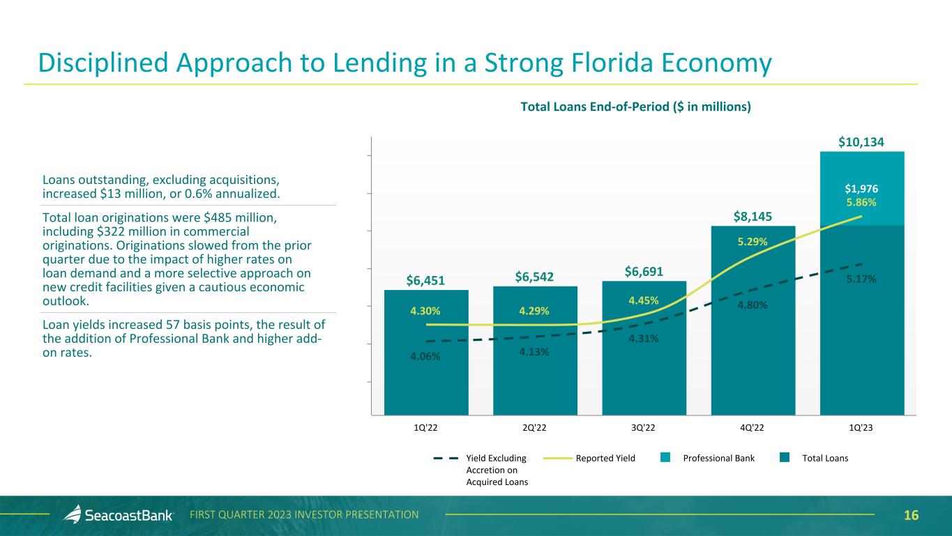 15FIRST QUARTER 2023 INVESTOR PRESENTATION Efficiency Ratio Trend - Continued Focus on Disciplined Expense Control Pa lm B ea ch C om m un ity a nd N or th S ta r Ba nk A cq ui si tio n 60% 50% 62% 48% 53% 55% 60% 54% 62% 56% 57% 63% 65% 1Q '20 2Q '20 3Q '20 4Q '20 1Q '21 2Q '21 3Q '21 4Q '21 1Q '22 2Q '22 3Q '22 4Q '22 1Q '23 54% 50% 55% 49% 52% 53% 51% 53% 55% 53% 53% 52% 53% 1Q '20 2Q '20 3Q '20 4Q '20 1Q '21 2Q '21 3Q '21 4Q '21 1Q '22 2Q '22 3Q '22 4Q '22 1Q '23 GAAP - Efficiency Adjusted - Efficiency1 • The efficiency ratio was 65.4% for the first quarter of 2023 compared to 63.4% in the prior quarter and 62.3% in the first quarter of 2022. • The adjusted efficiency ratio1 was 53.1% for the first quarter of 2023 compared to 51.5% in the prior quarter and 54.9% in the first quarter of 2022. 1Non-GAAP measure, see “Explanation of Certain Unaudited Non-GAAP Financial Measures" for more information and a reconciliation to GAAP. First Bank of the Palm Beaches Freedom Bank Legacy Bank of Florida Sabal Palm Bank and Florida Business Bank Drummond Bank and Apollo Bank Professional Bank