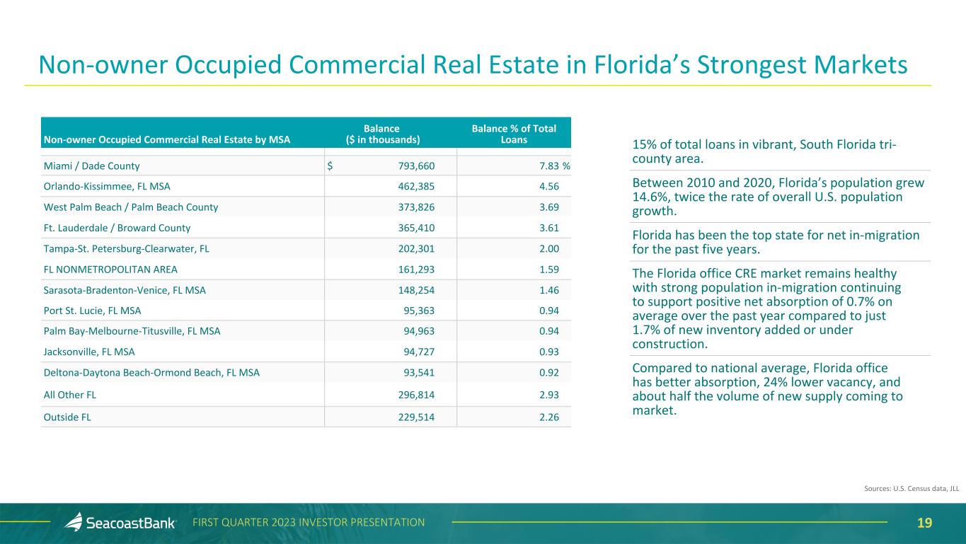18FIRST QUARTER 2023 INVESTOR PRESENTATION At March 31, 2023 Loan Portfolio Mix CRE-Retail, 9.92% CRE-Office, 6.10% CRE-Multifamily 5+, 4.69% CRE-Hotel/Motel, 4.02% CRE-Industrial/Warehouse, 3.54% CRE-Other, 5.39% OOCRE-Office, 4.83% OOCRE-Other, 11.47% Construction & Land Development, 7.48% Commercial & Financial, 16.29% Residential, 23.23% Consumer, 2.98% PPP, 0.05% Segment Balance ($ in thousands) % of Balance Non-Owner Occupied CRE Retail $ 1,005,724 9.92 % Office 618,377 6.10 Multifamily 5+ 475,261 4.69 Hotel/Motel 407,388 4.02 Industrial/Warehouse 358,620 3.54 Other 546,681 5.39 Total Non-Owner Occupied CRE $ 3,412,051 33.66 % OOCRE-Office 489,797 4.83 OOCRE-Other 1,162,694 11.47 Construction & Land Development 757,835 7.48 Commercial & Financial 1,650,485 16.29 Residential 2,354,394 23.23 Consumer 301,740 2.98 PPP 5,399 0.05 Total Loans $ 10,134,395 100.00 % Non-owner occupied commercial real estate are properties where the source of repayment is from the sale or lease of the property, or the owner does not occupy the property Owner-occupied CRE is used by the owner, where the primary source of repayment is the cash flow from business operations housed within the property.