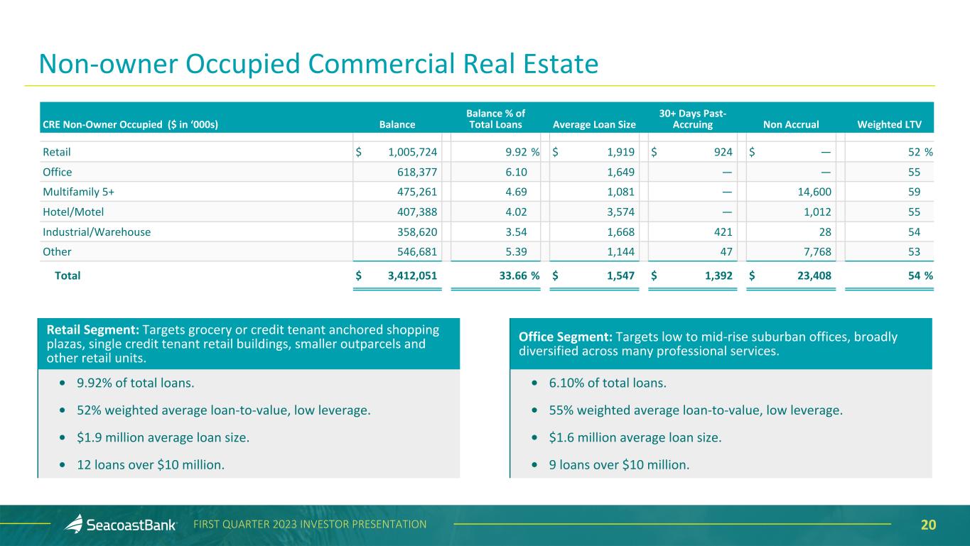 19FIRST QUARTER 2023 INVESTOR PRESENTATION Non-owner Occupied Commercial Real Estate in Florida’s Strongest Markets Non-owner Occupied Commercial Real Estate by MSA Balance ($ in thousands) Balance % of Total Loans Miami / Dade County $ 793,660 7.83 % Orlando-Kissimmee, FL MSA 462,385 4.56 West Palm Beach / Palm Beach County 373,826 3.69 Ft. Lauderdale / Broward County 365,410 3.61 Tampa-St. Petersburg-Clearwater, FL 202,301 2.00 FL NONMETROPOLITAN AREA 161,293 1.59 Sarasota-Bradenton-Venice, FL MSA 148,254 1.46 Port St. Lucie, FL MSA 95,363 0.94 Palm Bay-Melbourne-Titusville, FL MSA 94,963 0.94 Jacksonville, FL MSA 94,727 0.93 Deltona-Daytona Beach-Ormond Beach, FL MSA 93,541 0.92 All Other FL 296,814 2.93 Outside FL 229,514 2.26 15% of total loans in vibrant, South Florida tri- county area. Between 2010 and 2020, Florida’s population grew 14.6%, twice the rate of overall U.S. population growth. Florida has been the top state for net in-migration for the past five years. The Florida office CRE market remains healthy with strong population in-migration continuing to support positive net absorption of 0.7% on average over the past year compared to just 1.7% of new inventory added or under construction. Compared to national average, Florida office has better absorption, 24% lower vacancy, and about half the volume of new supply coming to market. Sources: U.S. Census data, JLL