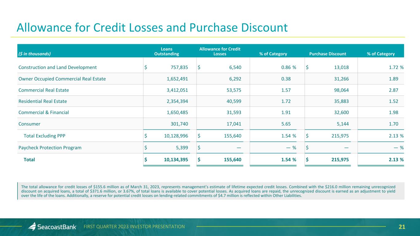 20FIRST QUARTER 2023 INVESTOR PRESENTATION Non-owner Occupied Commercial Real Estate CRE Non-Owner Occupied ($ in ‘000s) Balance Balance % of Total Loans Average Loan Size 30+ Days Past- Accruing Non Accrual Weighted LTV Retail $ 1,005,724 9.92 % $ 1,919 $ 924 $ — 52 % Office 618,377 6.10 1,649 — — 55 Multifamily 5+ 475,261 4.69 1,081 — 14,600 59 Hotel/Motel 407,388 4.02 3,574 — 1,012 55 Industrial/Warehouse 358,620 3.54 1,668 421 28 54 Other 546,681 5.39 1,144 47 7,768 53 Total $ 3,412,051 33.66 % $ 1,547 $ 1,392 $ 23,408 54 % Retail Segment: Targets grocery or credit tenant anchored shopping plazas, single credit tenant retail buildings, smaller outparcels and other retail units. • 9.92% of total loans. • 52% weighted average loan-to-value, low leverage. • $1.9 million average loan size. • 12 loans over $10 million. Office Segment: Targets low to mid-rise suburban offices, broadly diversified across many professional services. • 6.10% of total loans. • 55% weighted average loan-to-value, low leverage. • $1.6 million average loan size. • 9 loans over $10 million.