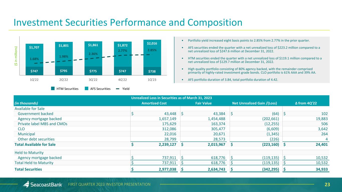 22FIRST QUARTER 2023 INVESTOR PRESENTATION Net Charge-Offs (Recoveries) $8,139 $7,591 $3,027 $841 $3,1880.16% 0.13% 0.05% 0.01% 0.14% NCO NCO/Average Loans 2019 2020 2021 2022 1Q'23 (% annualized) ($ in thousands) Nonperforming Loans and Classified Assets $26,955 $36,110 $30,598 $28,843 $50,787 0.52% 0.63% 0.52% 0.35% 0.50% 0.95% 1.30% 1.25% 0.89% 1.03% NPL NPL/Total Loans Classified Assets/Total Assets 2019 2020 2021 2022 1Q'23 $89,838 $90,769 $95,329 $113,895 $155,640 1.39% 1.39% 1.42% 1.40% 1.54% ACL ACL/Total Loans 1Q'22 2Q'22 3Q'22 4Q'22 1Q'23 Allowance for Credit Losses Continued Strong Asset Quality Trends Credit metrics remain strong, with charge-offs, nonperforming and classified assets at historically low levels. Net charge-offs for the four most recent quarters averaged 0.05%. The increase in the allowance for credit losses to total loans reflects primarily the addition of the Professional Bank portfolio in the first quarter of 2023.