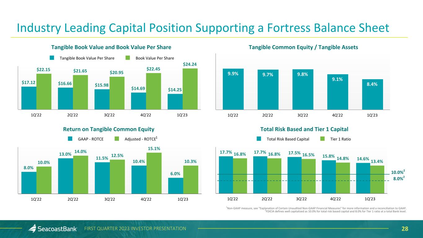27FIRST QUARTER 2023 INVESTOR PRESENTATION Liquidity Sources vs Uninsured Deposits Cash and Borrowing Capacity vs. Uninsured Deposits ($ in millions) $6,356 $3,888 $791 $2,661 $431 $1,496 $300 $677 Borrowing Capacity + Cash Uninsured and Uncollateralized Deposits Total Cash & Borrowing Capacity = $6.4 Billion Uninsured and Uncollateralized Deposits = $3.9 Billion Uninsured and uncollateralized deposits represent 32% of total deposits. Total liquidity sources of $6.4 billion compared to uninsured and uncollateralized deposits of $3.9 billion, representing a 163% coverage ratio. Without using FHLB borrowing capacity, lines of credit, or liquidating unpledged securities, SBCF could fund the loss of all uninsured and uncollateralized deposits with cash and borrowing capacity at the Federal Reserve. Uninsured deposits represent 36% of overall deposit accounts. This includes public funds, which are protected from loss beyond FDIC insurance limits. Unpledged Securities Lines of Credit Discount Window Cash BTFP FHLB