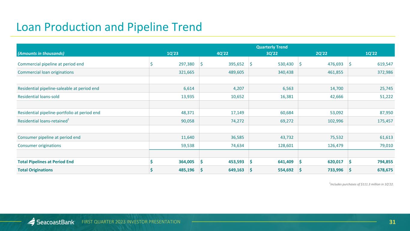 31FIRST QUARTER 2023 INVESTOR PRESENTATION Quarterly Trend (Amounts in thousands) 1Q'23 4Q'22 3Q'22 2Q'22 1Q'22 Commercial pipeline at period end $ 297,380 $ 395,652 $ 530,430 $ 476,693 $ 619,547 Commercial loan originations 321,665 489,605 340,438 461,855 372,986 Residential pipeline-saleable at period end 6,614 4,207 6,563 14,700 25,745 Residential loans-sold 13,935 10,652 16,381 42,666 51,222 Residential pipeline-portfolio at period end 48,371 17,149 60,684 53,092 87,950 Residential loans-retained1 90,058 74,272 69,272 102,996 175,457 Consumer pipeline at period end 11,640 36,585 43,732 75,532 61,613 Consumer originations 59,538 74,634 128,601 126,479 79,010 Total Pipelines at Period End $ 364,005 $ 453,593 $ 641,409 $ 620,017 $ 794,855 Total Originations $ 485,196 $ 649,163 $ 554,692 $ 733,996 $ 678,675 1Includes purchases of $111.3 million in 1Q’22. Loan Production and Pipeline Trend