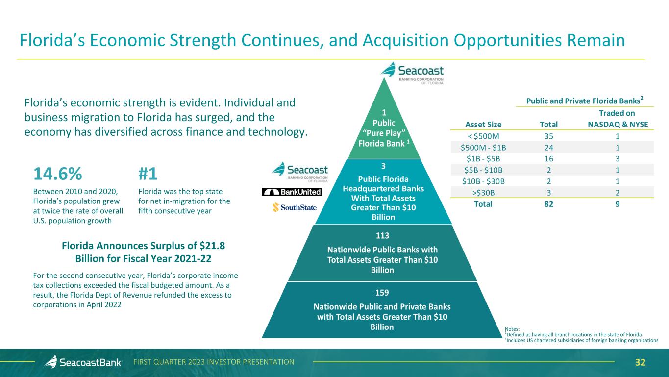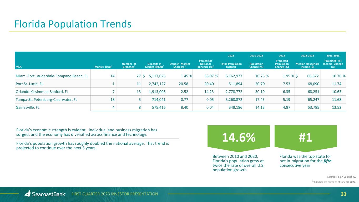 32FIRST QUARTER 2023 INVESTOR PRESENTATION Florida’s Economic Strength Continues, and Acquisition Opportunities Remain Florida’s economic strength is evident. Individual and business migration to Florida has surged, and the economy has diversified across finance and technology. 14.6% Between 2010 and 2020, Florida’s population grew at twice the rate of overall U.S. population growth #1 Florida was the top state for net in-migration for the fifth consecutive year For the second consecutive year, Florida’s corporate income tax collections exceeded the fiscal budgeted amount. As a result, the Florida Dept of Revenue refunded the excess to corporations in April 2022 Florida Announces Surplus of $21.8 Billion for Fiscal Year 2021-22 Notes: 1Defined as having all branch locations in the state of Florida 2Includes US chartered subsidiaries of foreign banking organizations